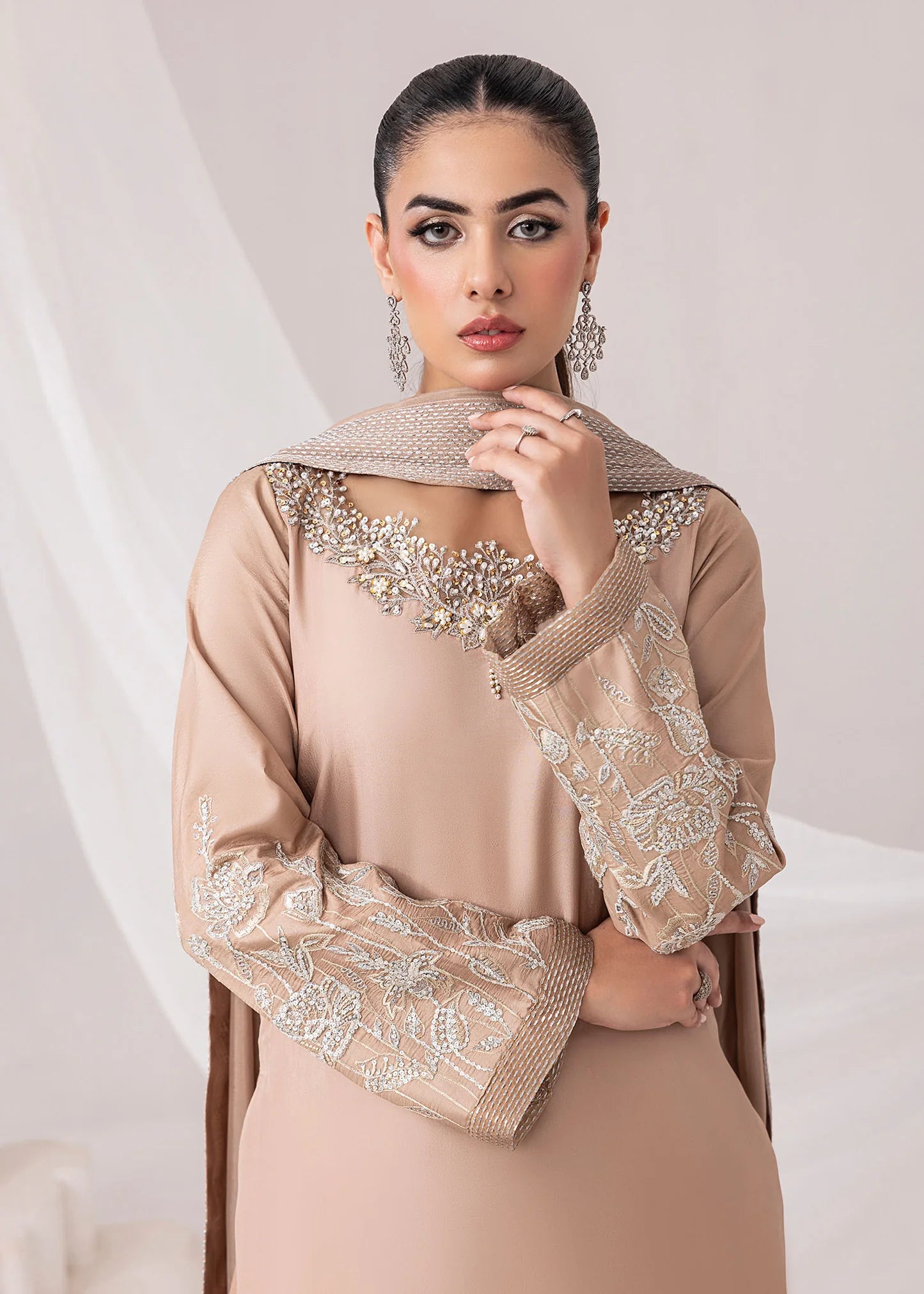 • Premium silk with a statement embroidered neckline with crystals and pearl adaa work