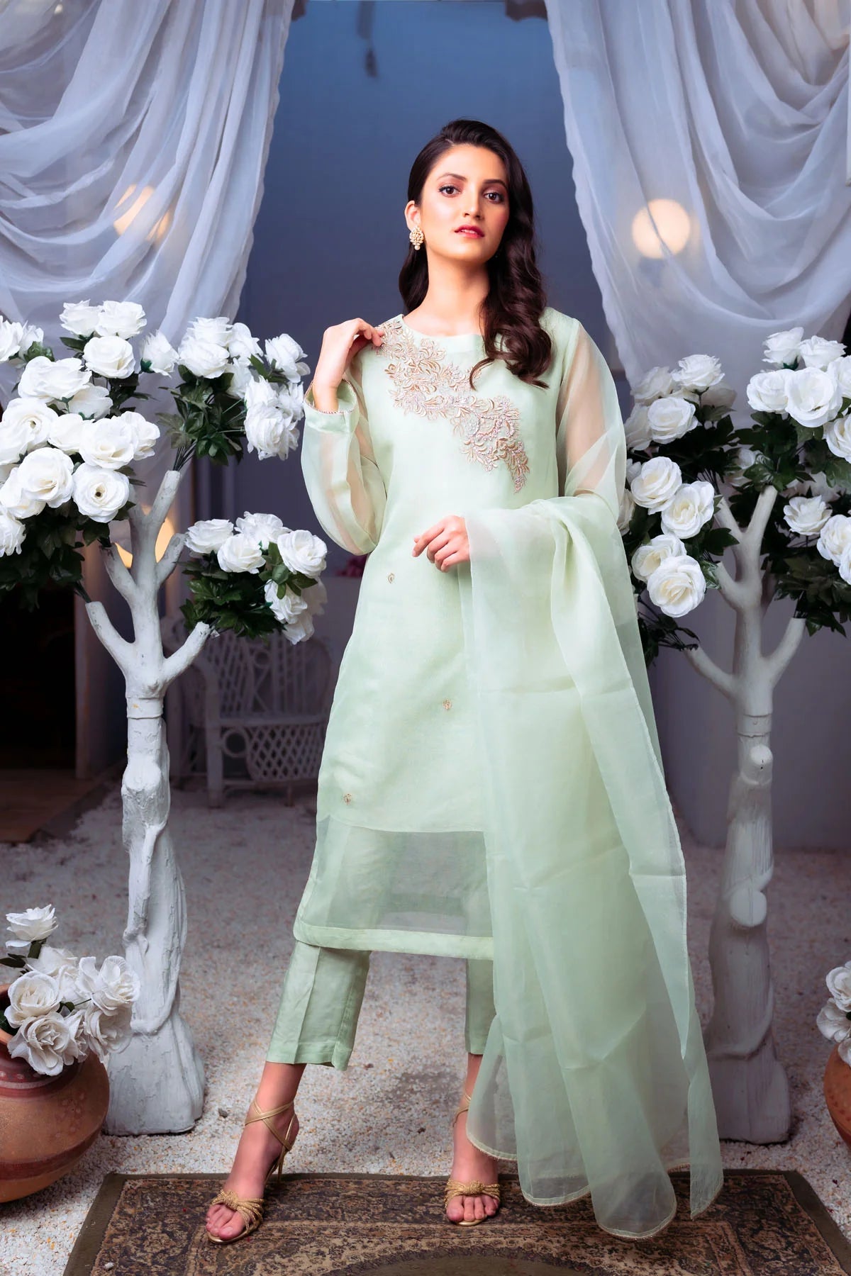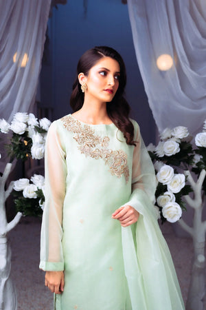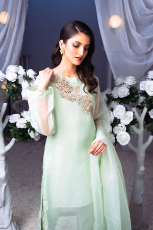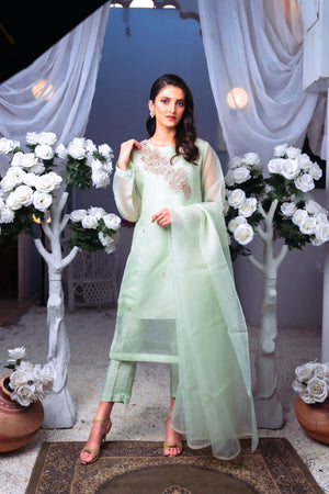 - This sea green organza dress is a masterpiece inspired by the twirling butterfly and metamorphosis. The classic straight cut with a modern fusion is perfect for any morning or evening affair. The dress features 3D handcrafted Mashed Gota and Tilla work, adding a streak of experimentation and fearlessness to the design. The fabric used for the dupatta is tissue organza, with a unique dual side broad frill work, giving it a creative twist. The slip is made of cotton silk, providing comfort throughout the day. The shirt is made of tissue organza, and the trouser is made of Blended Raw Silk, giving it a boost. The trouser type is Capri, and the model is wearing a size small, with a length of 34.This dress symbolizes beauty and delicacy, with a silhouette carved to make it shine no matter where we go. With the slip included, this dress is perfect for any occasion. All suits are stitched, ensuring the perfect fit for every customer.