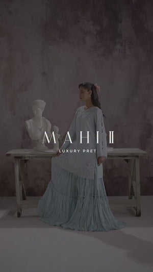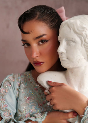 Crafted on a serene blue base, this outfit is designed in luxurious tissue silk and elevated with delicate embroidery, soft embellishments, and subtle pearl detailing. Gentle hints of pink add a refined warmth, creating an effortless harmony that feels elegant without trying too hard. Timeless, graceful, and memorable, this piece is made to solve that “nothing to wear” moment and is a personal favorite of the designer.