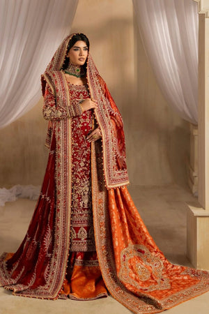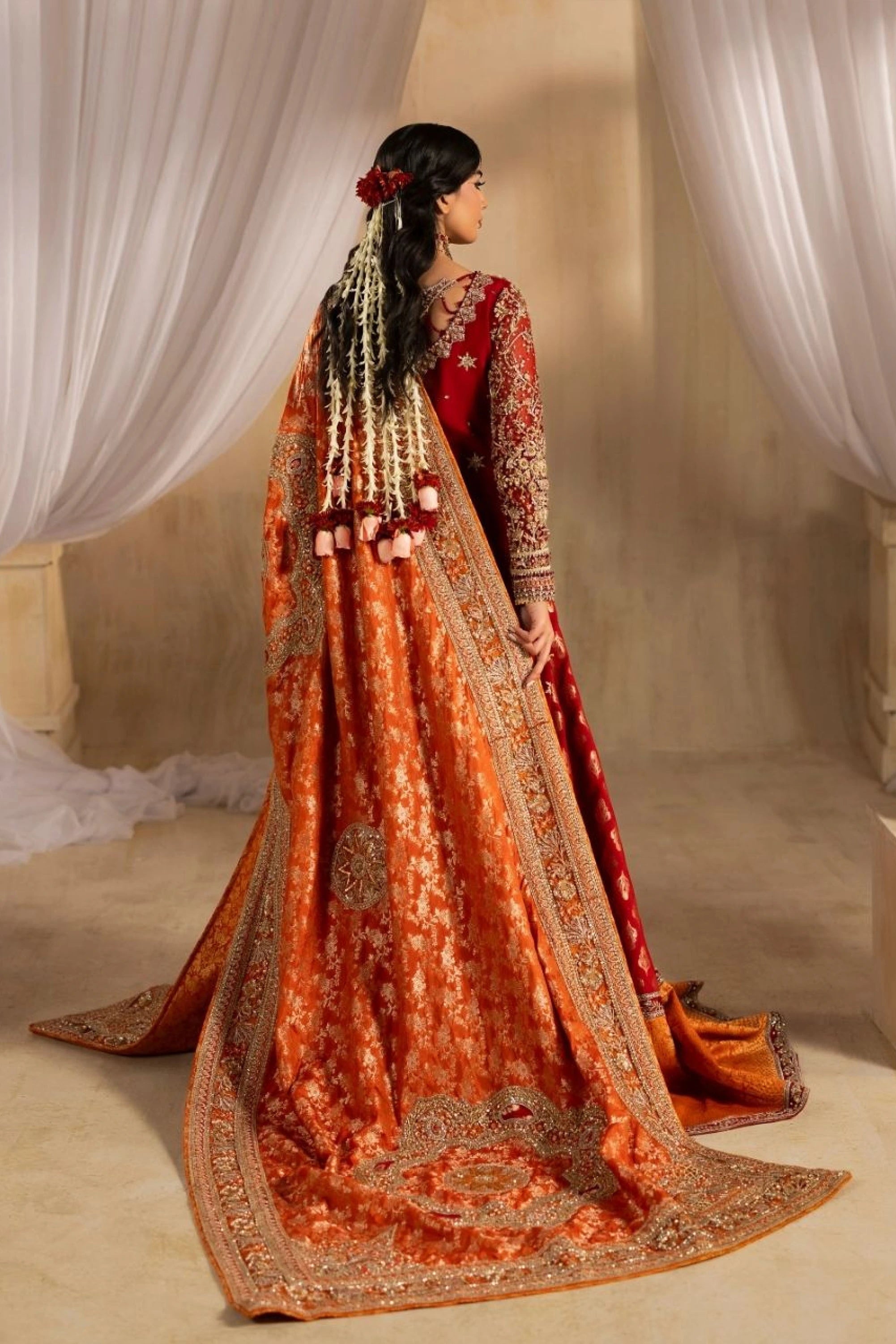 The look is completed with a dupatta featuring a hand-worked matha patti, ensuring that every drape exudes the aura of a bride from a bygone era of splendor. (Note: The rust self-printed silk shawl is a separate royal addition).
