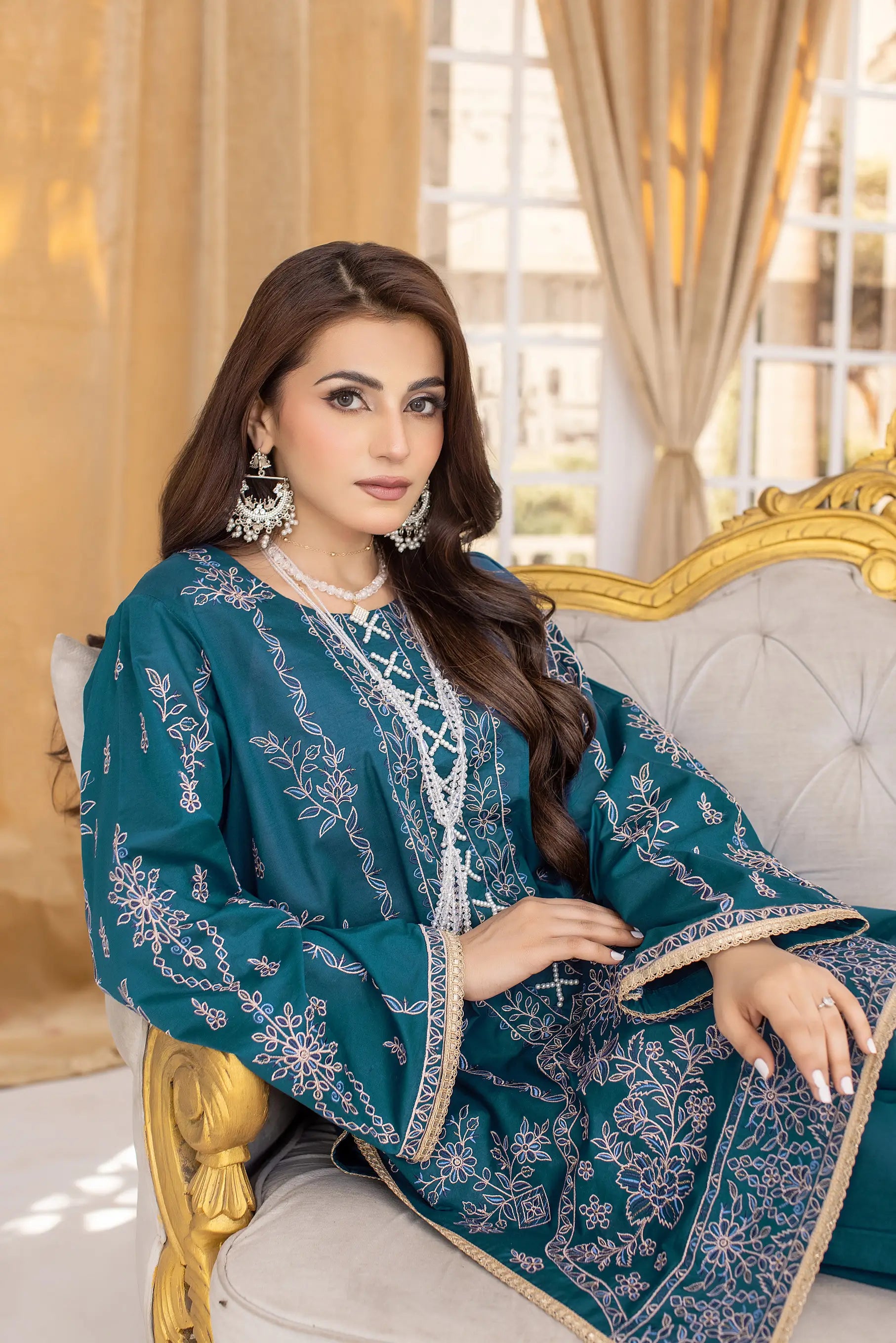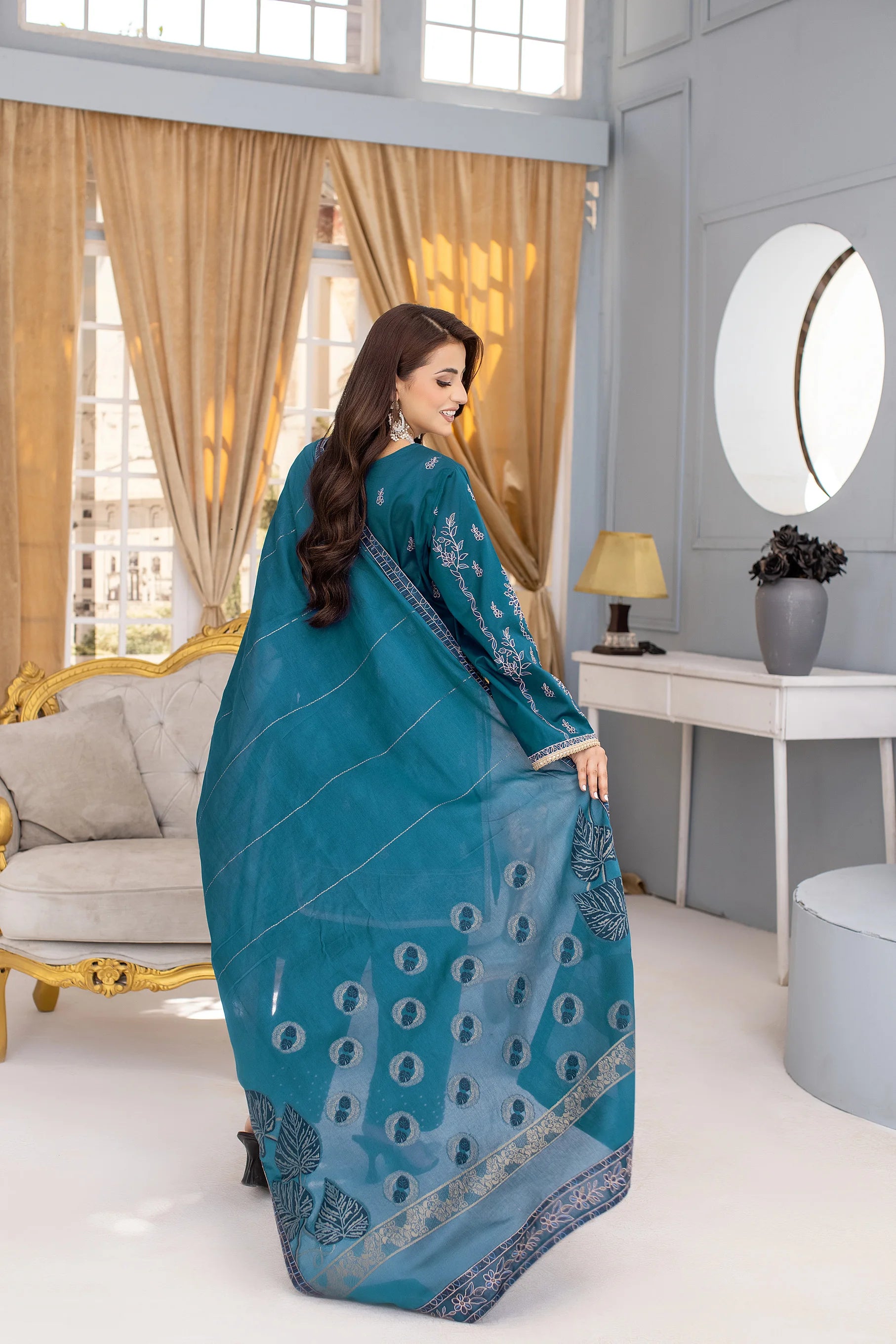 3pc Embroidered Lawn with Lawn Jacquard Dupatta & Cotton Trouser.