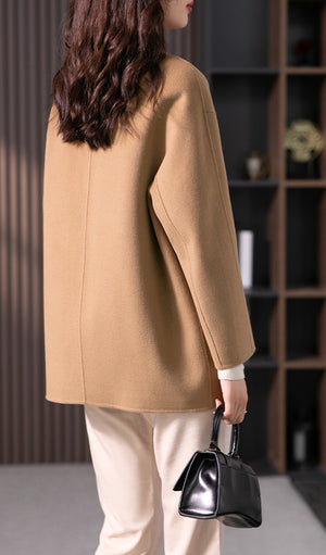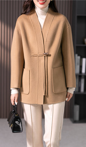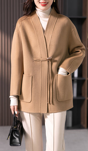 Experience effortless style with The Drape Wool Coat. Crafted from a premium wool blend, this jacket is designed with a relaxed, flowing silhouette that falls beautifully and offers superior comfort. Its minimalist V-neck and unique T-toggle closure add a sophisticated, modern touch. Perfect for layering during cooler seasons, this coat merges cozy warmth with an elegant, versatile aesthetic.