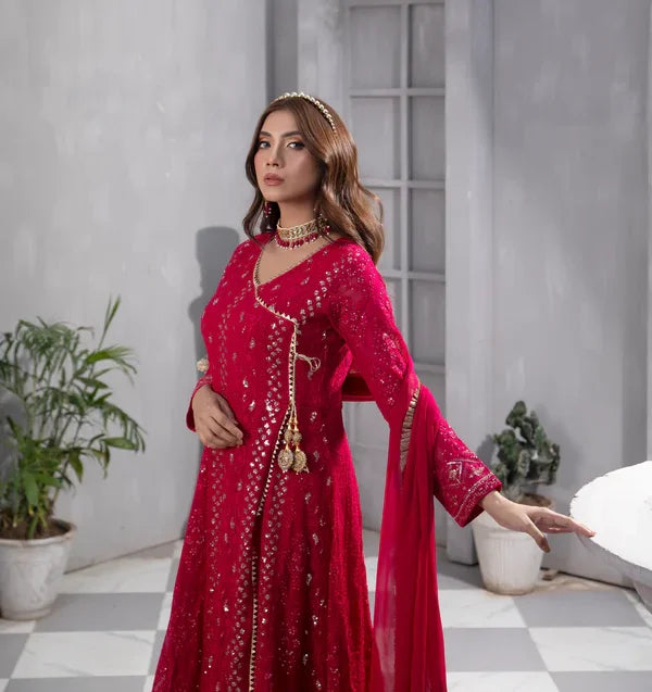 - This stunning fully embroidered angrakha which has an intricate sequence work. Lovely handmade dori tassel and gota laces are added to give it a polished appearance. You can wear this adaptable outfit to both daytime and evening events. This magnificent shirt is worn with a plain chiffon dupatta bordered with kiran lace and a pair of malai crap pants. This season, you need this artsy attire if you want to rock the chic appearance.