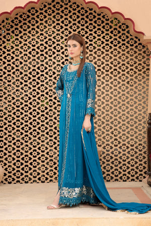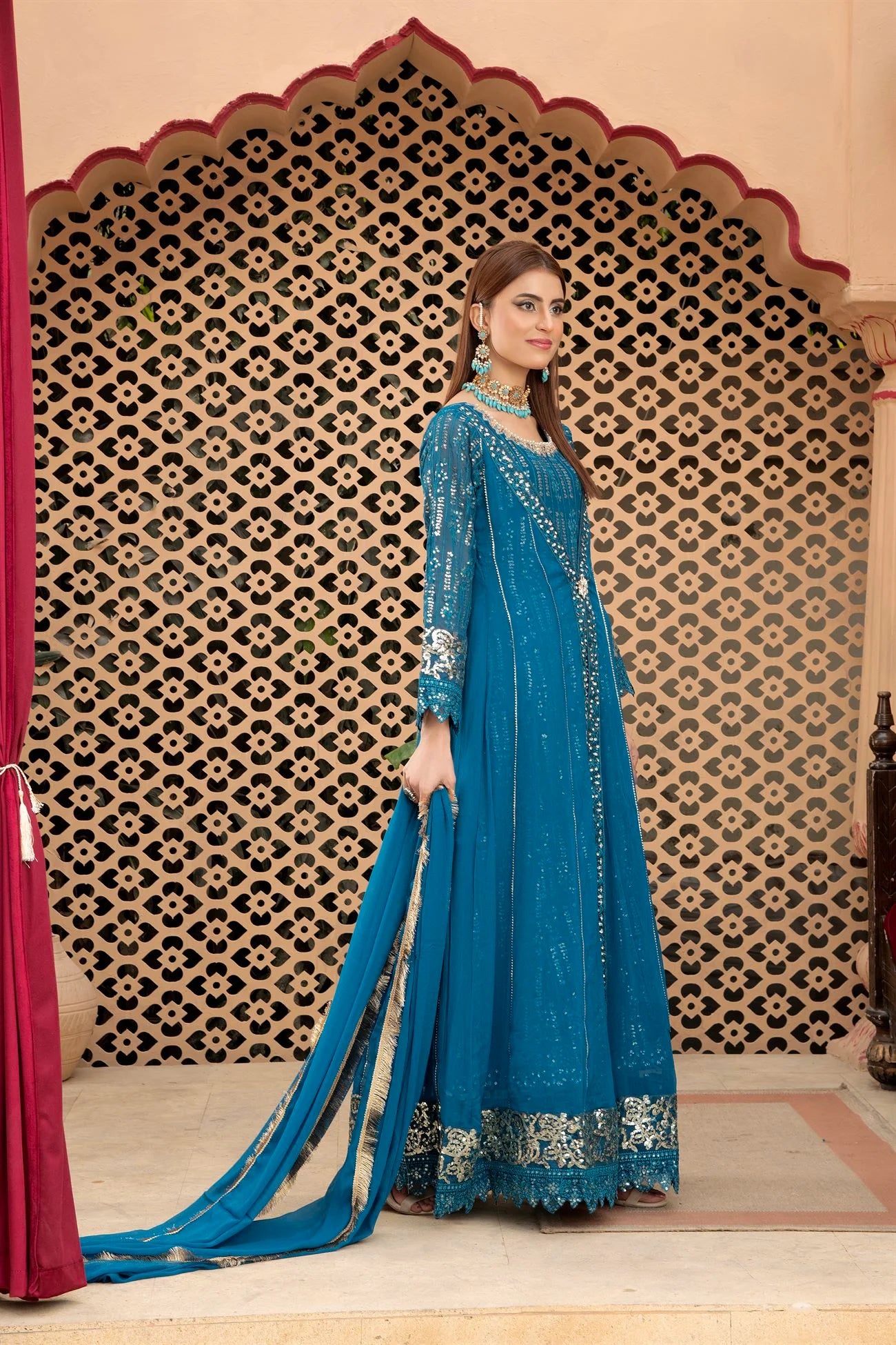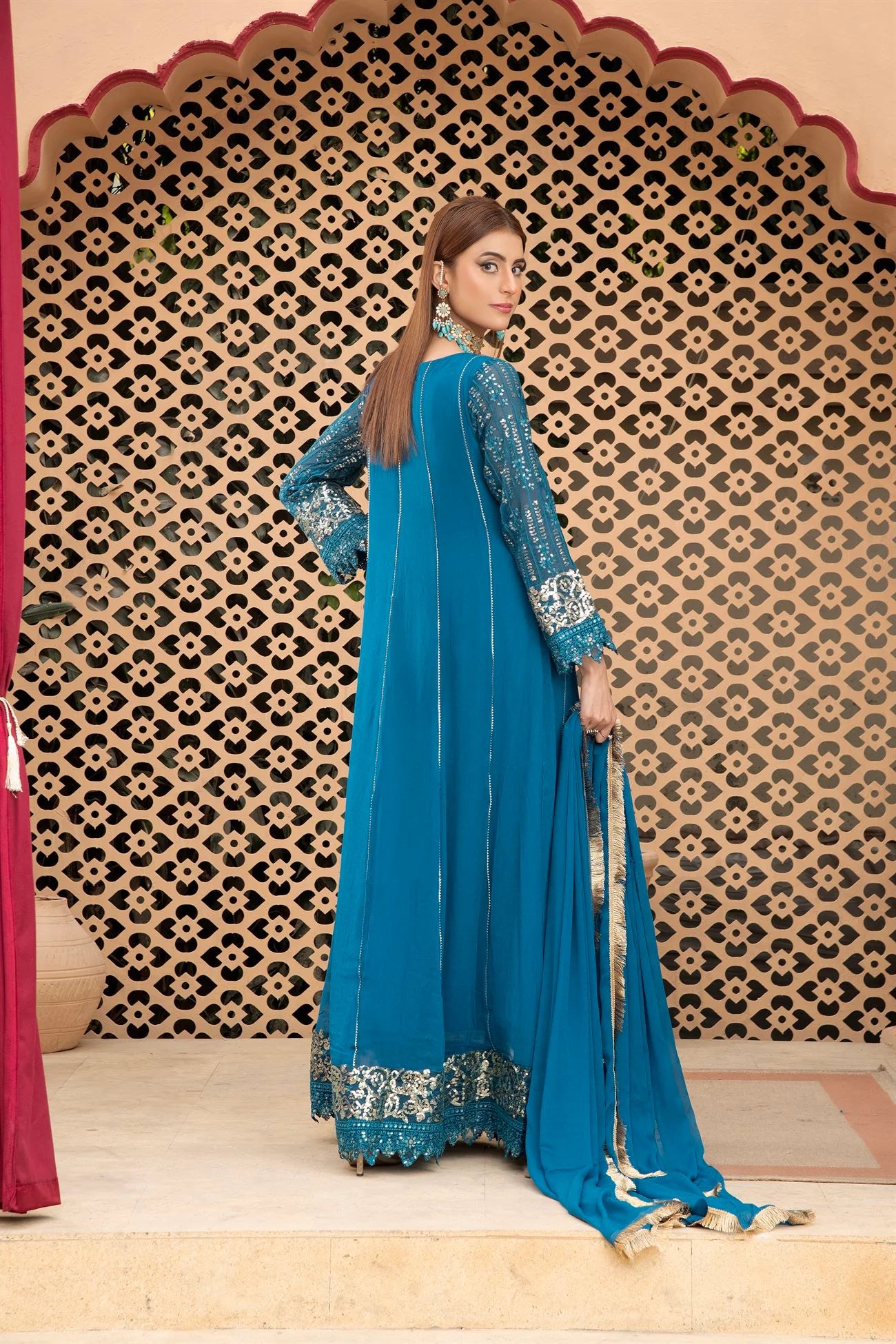 - There is exquisite embroidery work in vertical patterns, which exudes grace and elegance, is a marvel of craftsmanship and design. The designer’s exquisite use of the tilla , sitara, embalished , and sequin embroidery technique enhances this lovely dress. A gorgeous chiffon dupatta with a kiran lace border completes the ensemble. Make use of Mona Embroidery to showcase your individual style and embrace it.