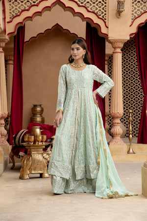 - There is exquisite embroidery work in vertical patterns, which exudes grace and elegance, is a marvel of craftsmanship and design. The designer’s exquisite use of the tilla , sitara, embalished , and sequin embroidery technique enhances this lovely dress. A gorgeous chiffon dupatta with a kiran lace border completes the ensemble. Make use of Mona Embroidery to showcase your individual style and embrace it.