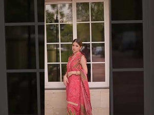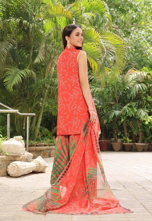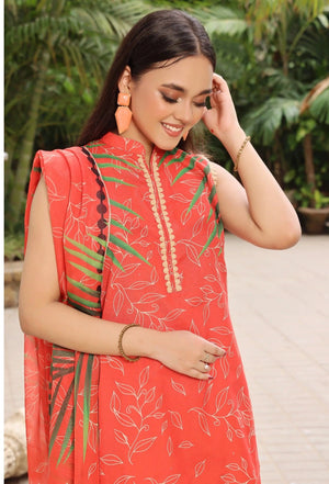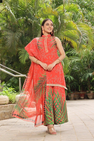 Introducing Dulcet. Swiss Lawn with an orange base, self-scattered prints, and leafy designs on the upper body and culottes. Paired with a soft silk dupatta with leafy prints. Ideal for a chic summer outfit!