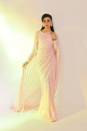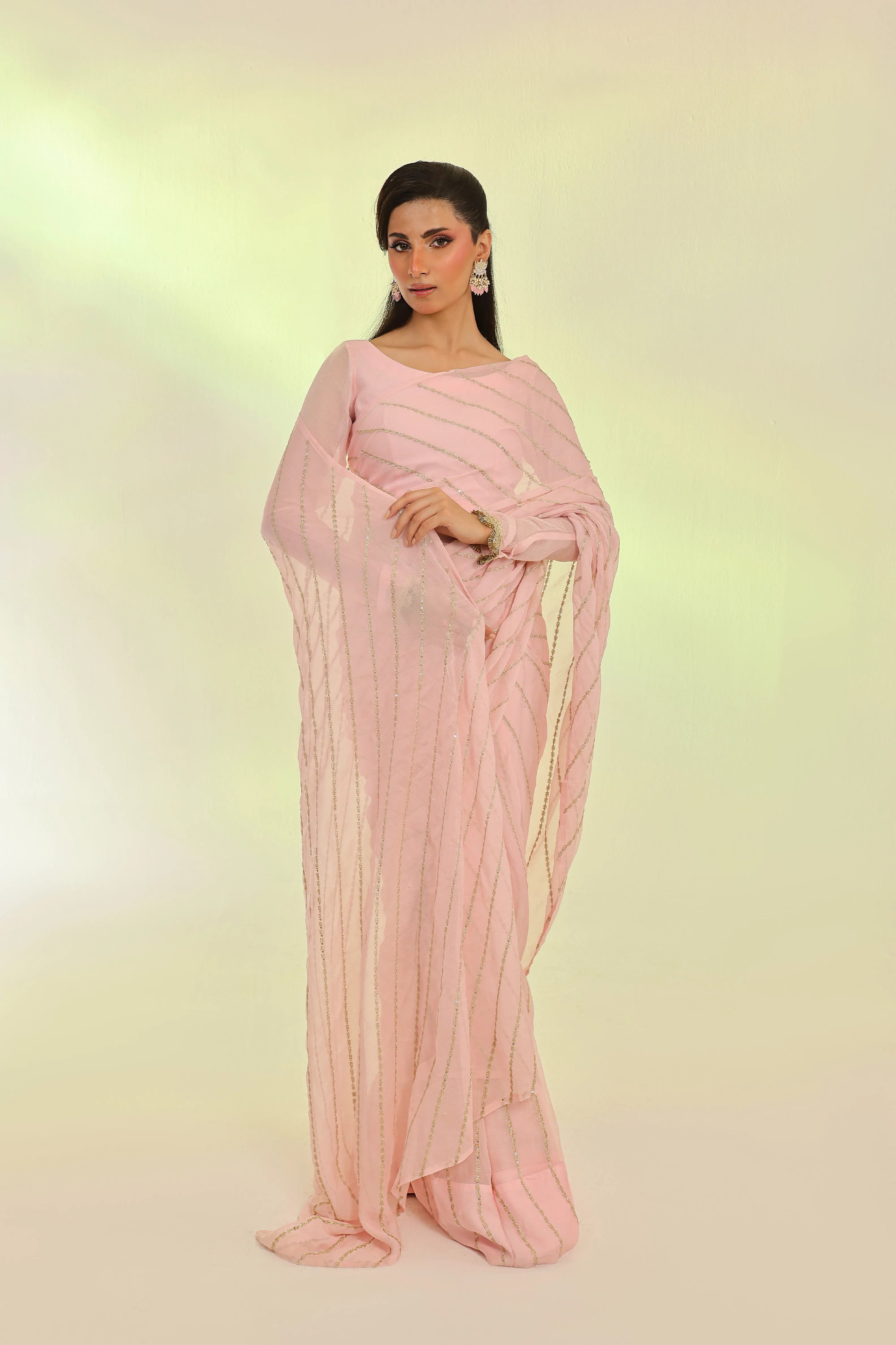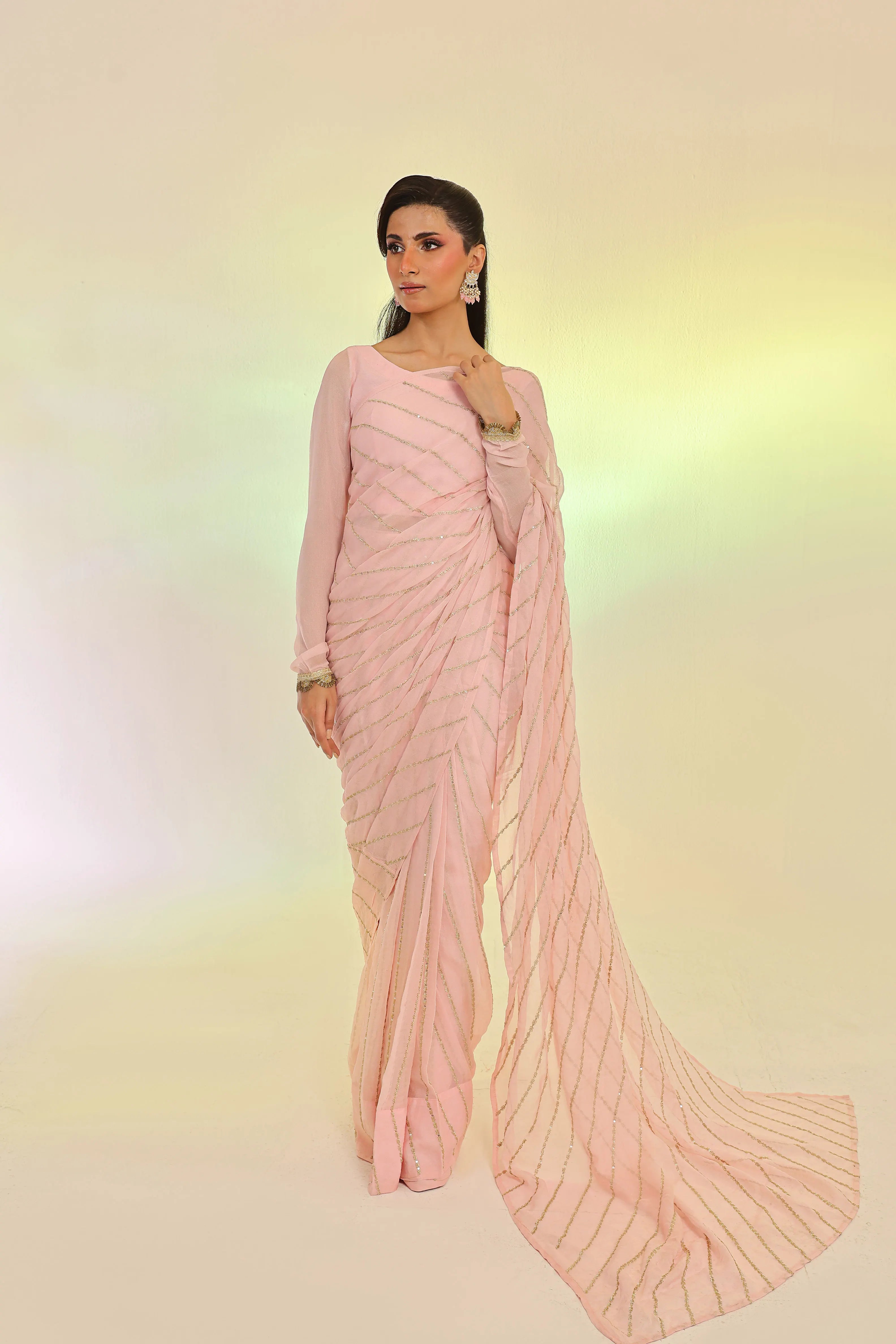 Soft femininity meets opulent craftsmanship. This ethereal pink chiffon saree is adorned with intricate golden sequin embroidery, creating a radiant, light-catching shimmer with every movement. Paired with a sleek chiffon blouse and a fluid malayi petticoat, it drapes to perfection—an embodiment of grace, luxury, and effortless allure.