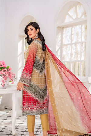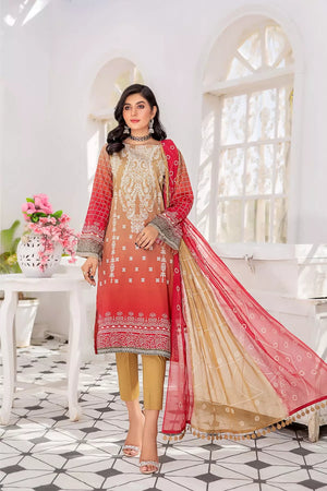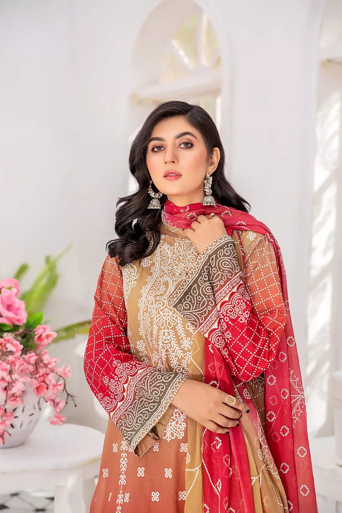 3pc Embroidered & Printed Lawn with Tie & Dye Embroidered Chiffon Dupatta & Plain Cotton Trousers.