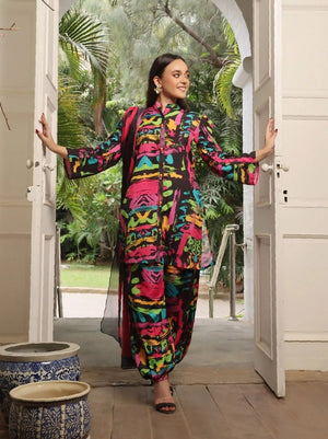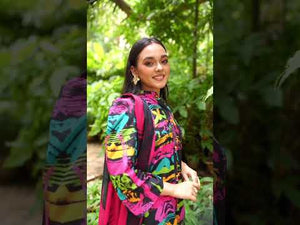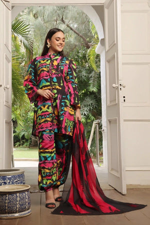 Discover Ebullience. Swiss Lawn with a black base, rich colorful textures, and a soft silk dupatta with black and red scattered designs. Perfect for a vibrant summer look!