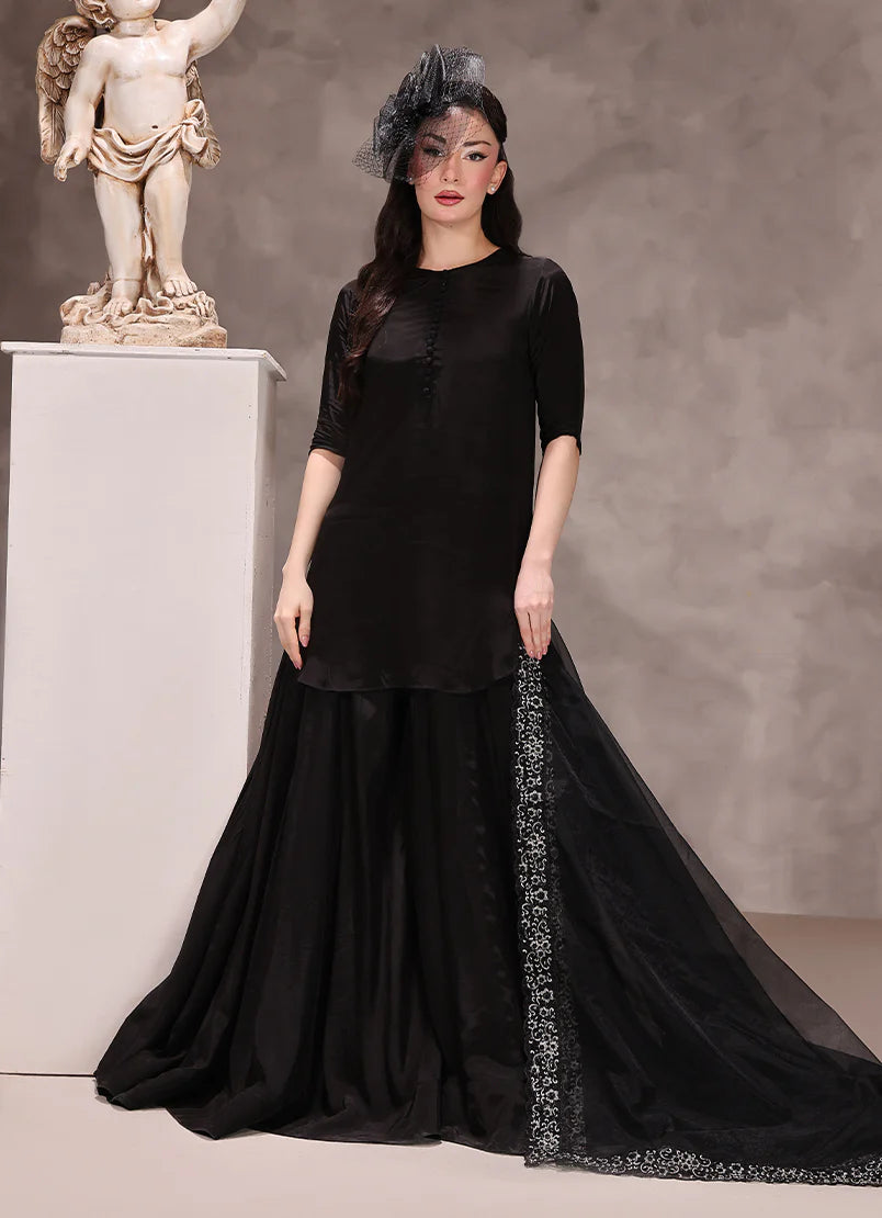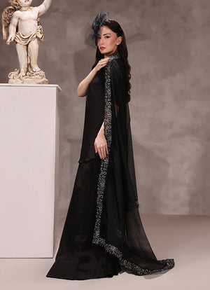 Classic black meets modern luxury in this premium ensemble. Crafted from finest quality of tussle silk the shirt is paired with striking panelled dhaka pants, designed with extreme flare and a 4-inch fused hem for a neat finish. The organza dupatta is heavily embellished with sequin & tilla, adding a touch of grandeur. Defined by its bold cut and crafted in the finest fabrics, this three piece is a must buy.