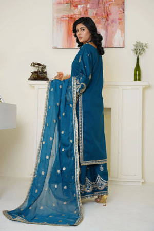 Elegant Teal Blue Embroidered Lawn 3 PCs