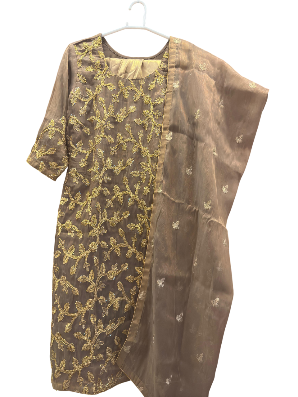 This exquisite embroidered tissue shirt, paired with a matching embroidered tissue dupatta, offers a refined, sophisticated look. The shimmer silk trouser adds a touch of glamour, completing the ensemble with perfect balance. Ideal for weddings or special events, this outfit exudes timeless elegance and style.