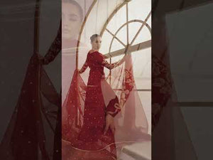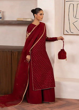 Command attention in rich mahroon red. This ensemble features a tissue silk shirt and trouser, complemented by a sheer organza dupatta. Intricate accents evoke timeless sophistication, perfect for those who love classic opulence.