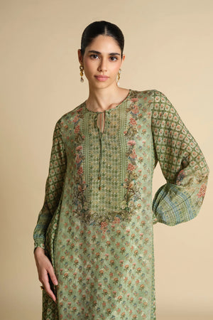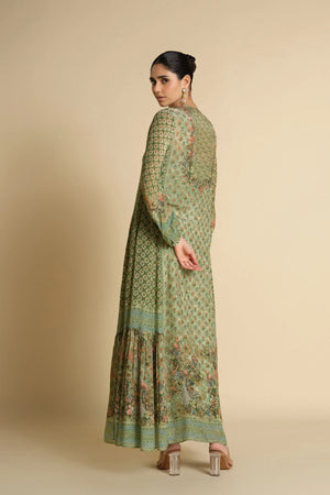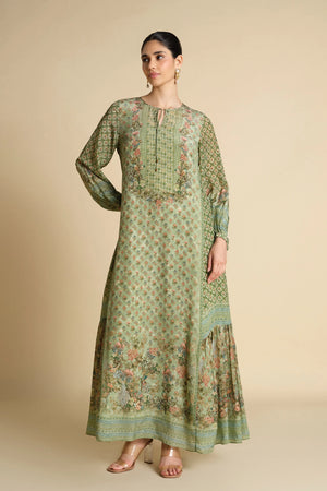 Drift into effortless elegance with the 'Emerald Bloom' one-piece ensemble, beautifully crafted from a luxurious printed cotton silk. This exquisite piece features a delicate tapestry of blooming florals and subtle geometric patterns in soft, harmonious hues of green and blush. The flowing silhouette and intricate detailing create a look of serene sophistication, perfect for a graceful and captivating presence. 🌿🌸✨