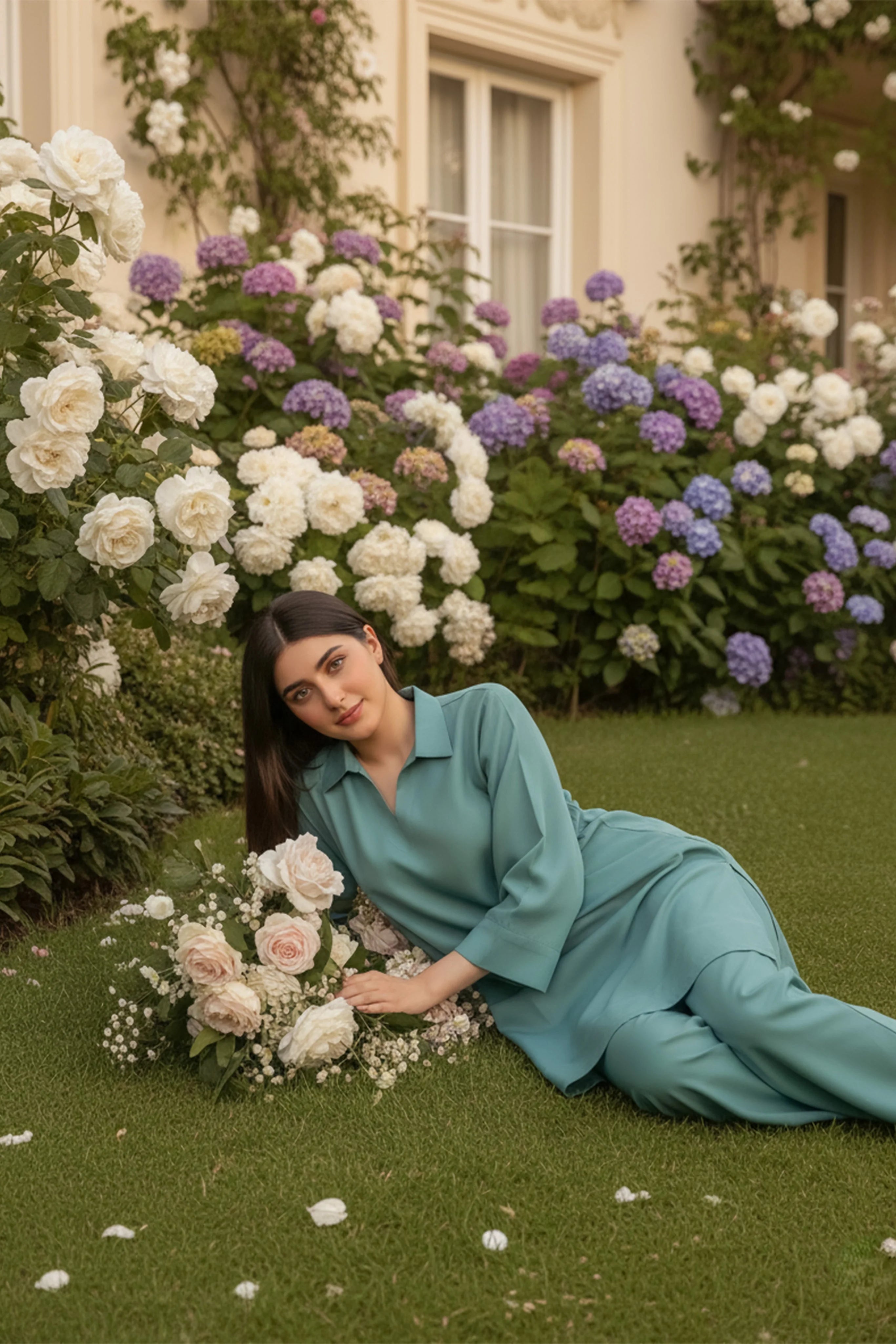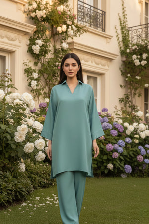 Top: Straight long kurta with a soft collar & V-slit neckline