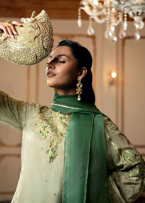 suit from our latest collection. The sky blue chiffon silk shirt is adorned with intricate resham and tilla embroidery, complemented by delicate sequins and crystal hand embellishments. The organza dupatta features stunning embroidered borders, secured with a zari Dori on all four sides. Complete the look with the premium pk silk flayered trousers. Embrace luxury and elegance like never before.