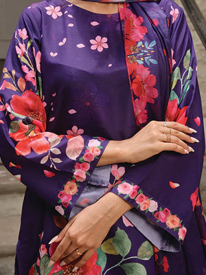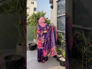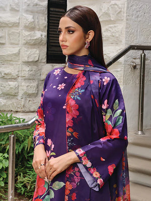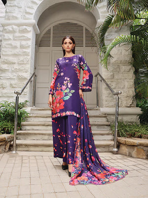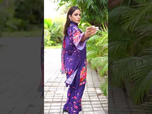 Discover Ephemeral. Swiss Lawn with a purple base, floral prints, and petal-detailed trousers. Paired with a soft silk dupatta with colorful floral borders. Perfect for a stunning summer look!