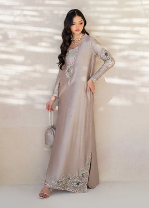 In the serene nights of Eid, Eris, shines with understated elegance. This grey ensemble combines tissue silk fabrics with intricate hand embroidery and sequin work, complemented by an Organza dupatta. Ideal for those who crave timeless sophistication during the festive season!