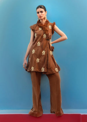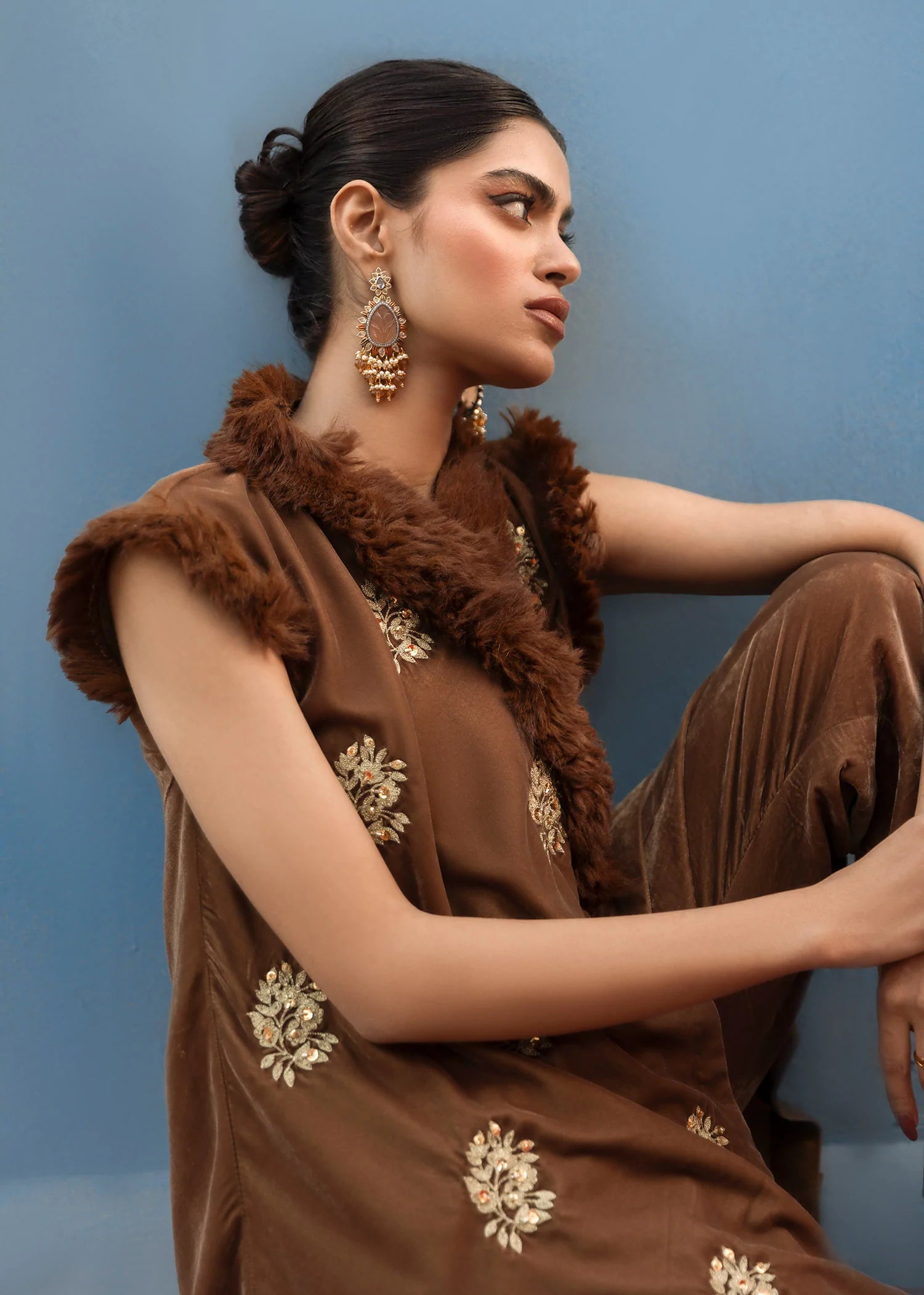 Brown velvet two-piece with tilla embroidery front back sitaraa work with fur on sleeves and neck.