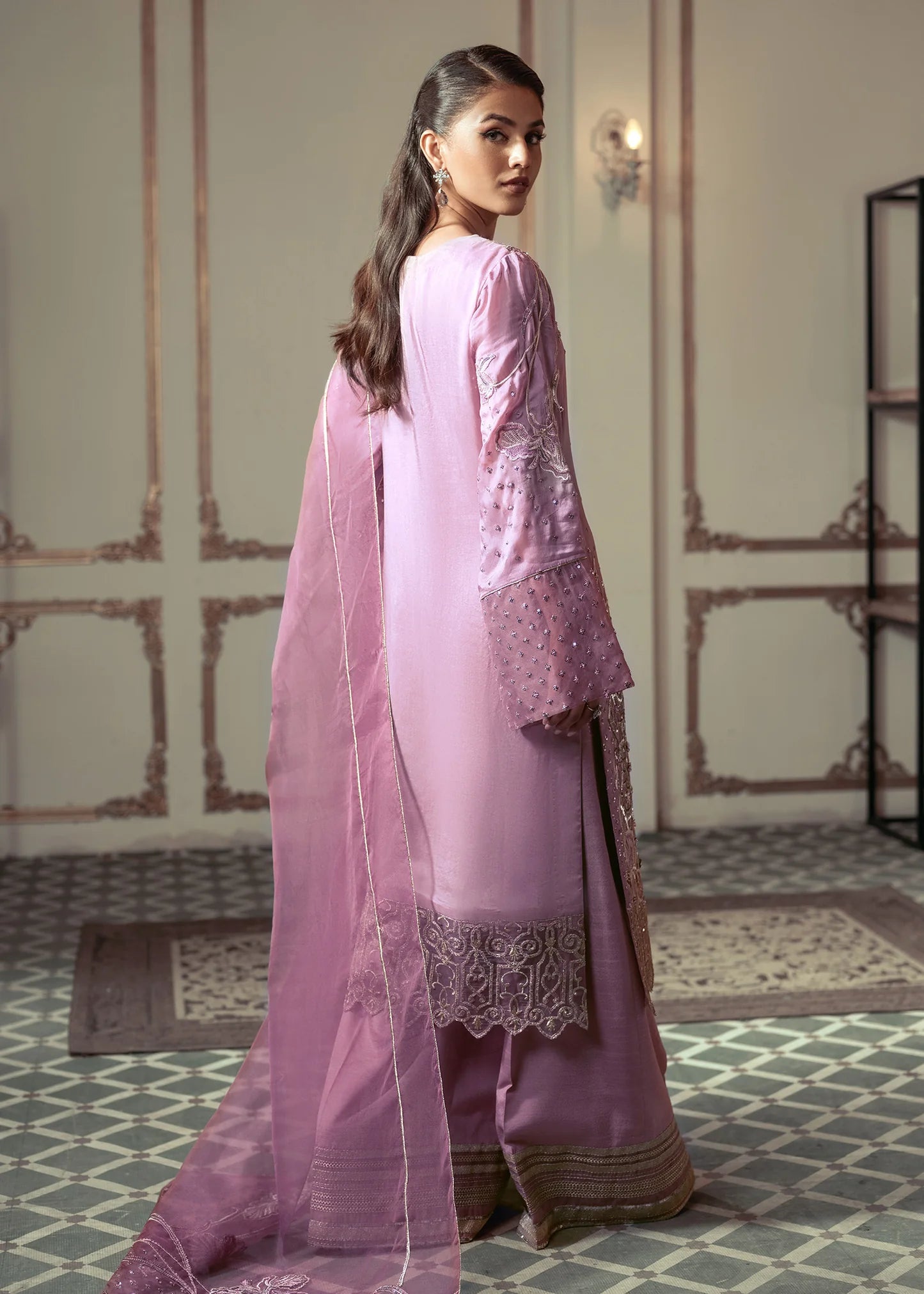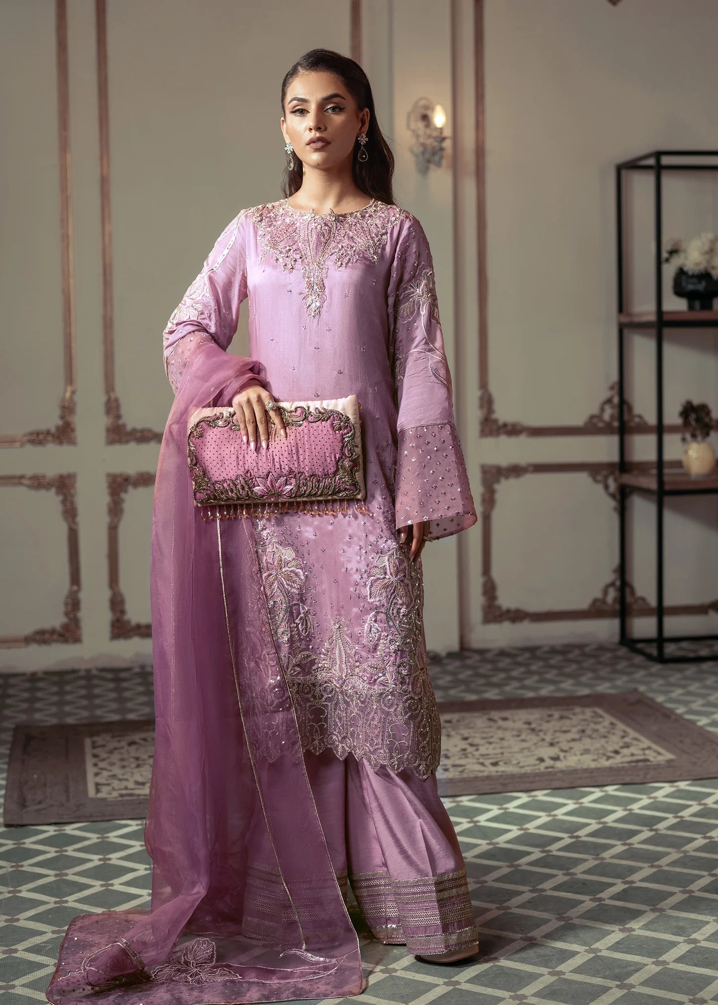 Step into the enchanting world of mystrical gardens with this exquisite 3-piece suit from our latest collection. The mauve pink chiffon silk shirt is adorned with intricate resham and tilla embroidery, complemented by delicate sequins and crystal hand embellishments. The organza dupatta features stunning embroidered borders, secured with a zari Dori on all four sides. Complete the look with the premium pk silk flayered trousers. Embrace luxury and elegance like never before.