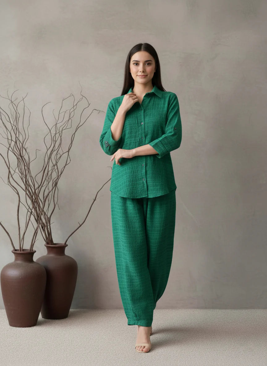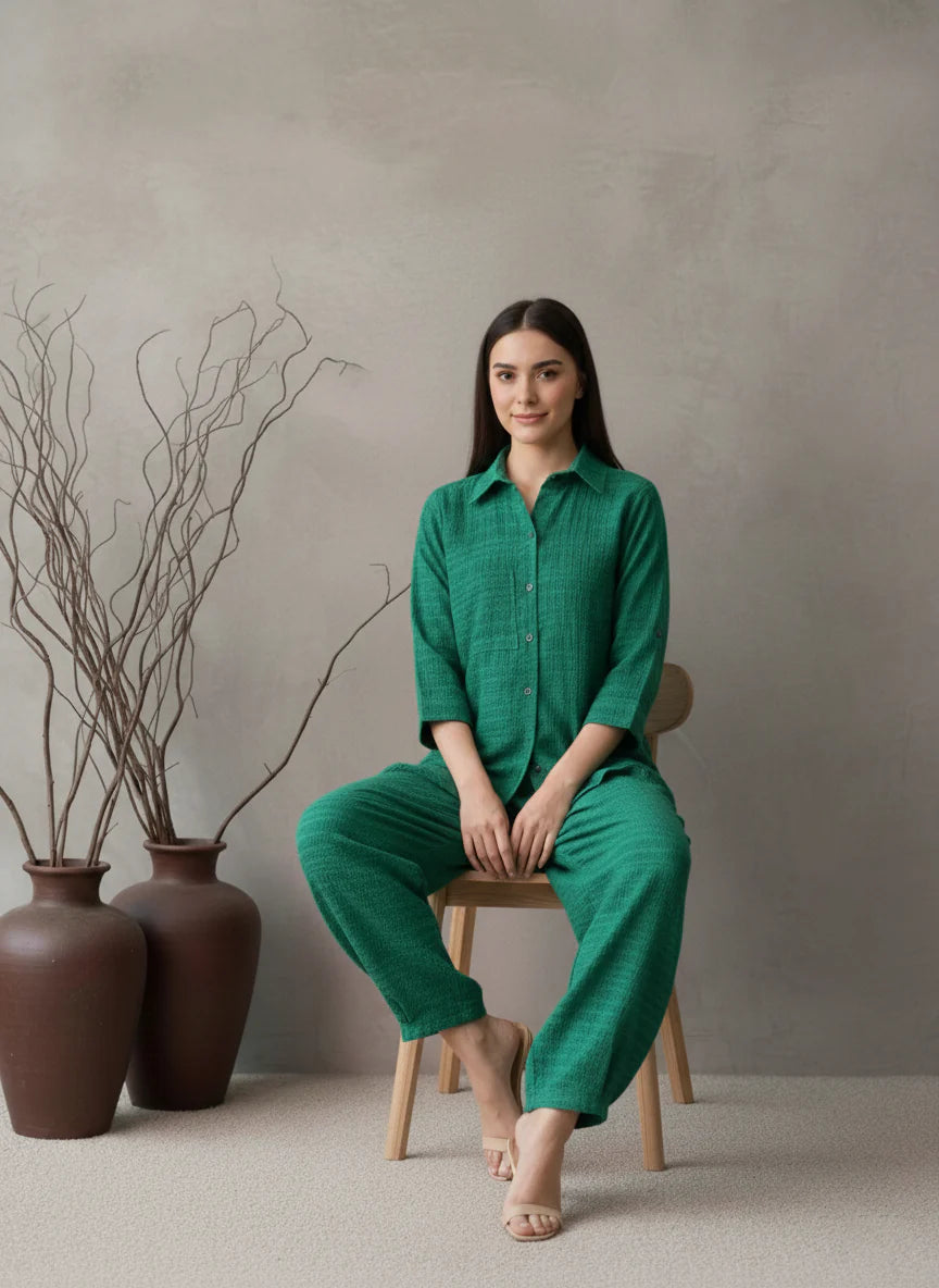 Crafted from breathable Imported Cotton with a subtle woven texture, this vibrant green suit features a classic collared shirt with three-quarter sleeves and comfortably wide, relaxed-fit trousers. The striking color and tactile fabric make it a statement piece for casual or festive occasions. This set offers a vibrant, comfortably chic, and effortlessly relaxed look.
