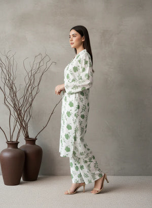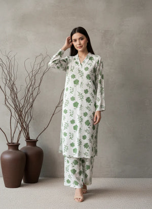 Made from light and flowy printed Georgette fabric, this two-piece suit features a striking botanical print in fresh green and crisp white. The classic kurta style offers comfortable sophistication, making it an ideal choice for elevated daily wear or festive occasions. The breathable georgette drapes elegantly, ensuring a refined and timeless look.