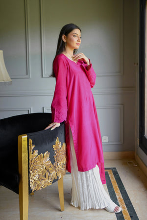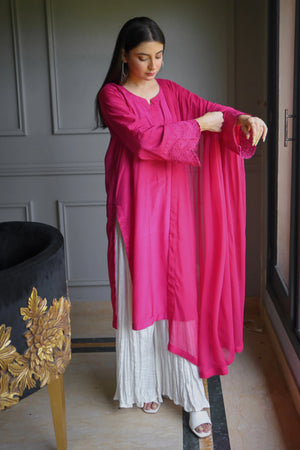 It’s a three piece dress includes embroidered shirt and crushed dhaka lehanga along with chiffon dupatta.
