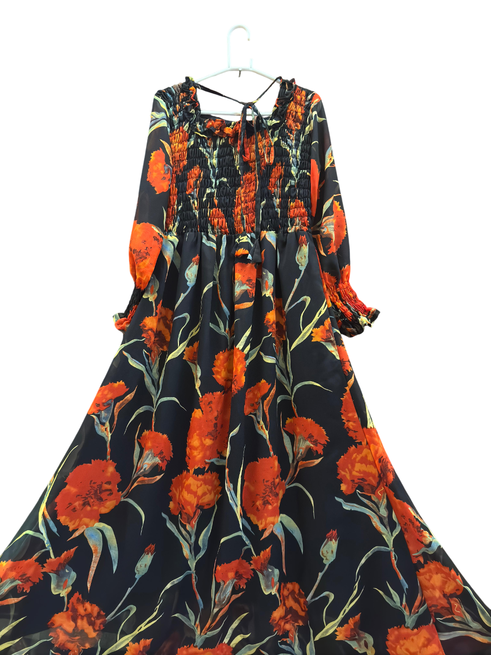 A stunning printed chiffon long frock that effortlessly blends style and comfort. With its vibrant floral design and flowing silhouette, this frock is perfect for casual outings or festive occasions. Light, airy, and elegant, it’s a wardrobe essential for a chic, feminine look!