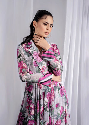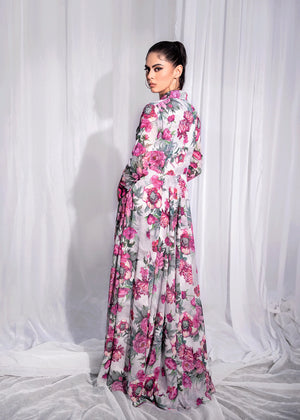Floral Flared Floor Length frock crafted in Georgette Chiffon Fabric with a tiered bodice and a belt to tie at the front.