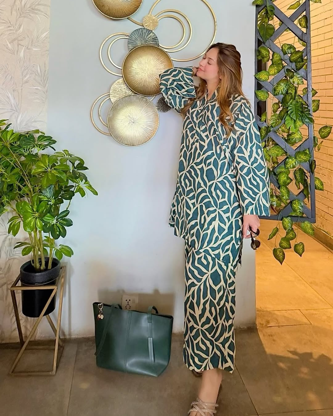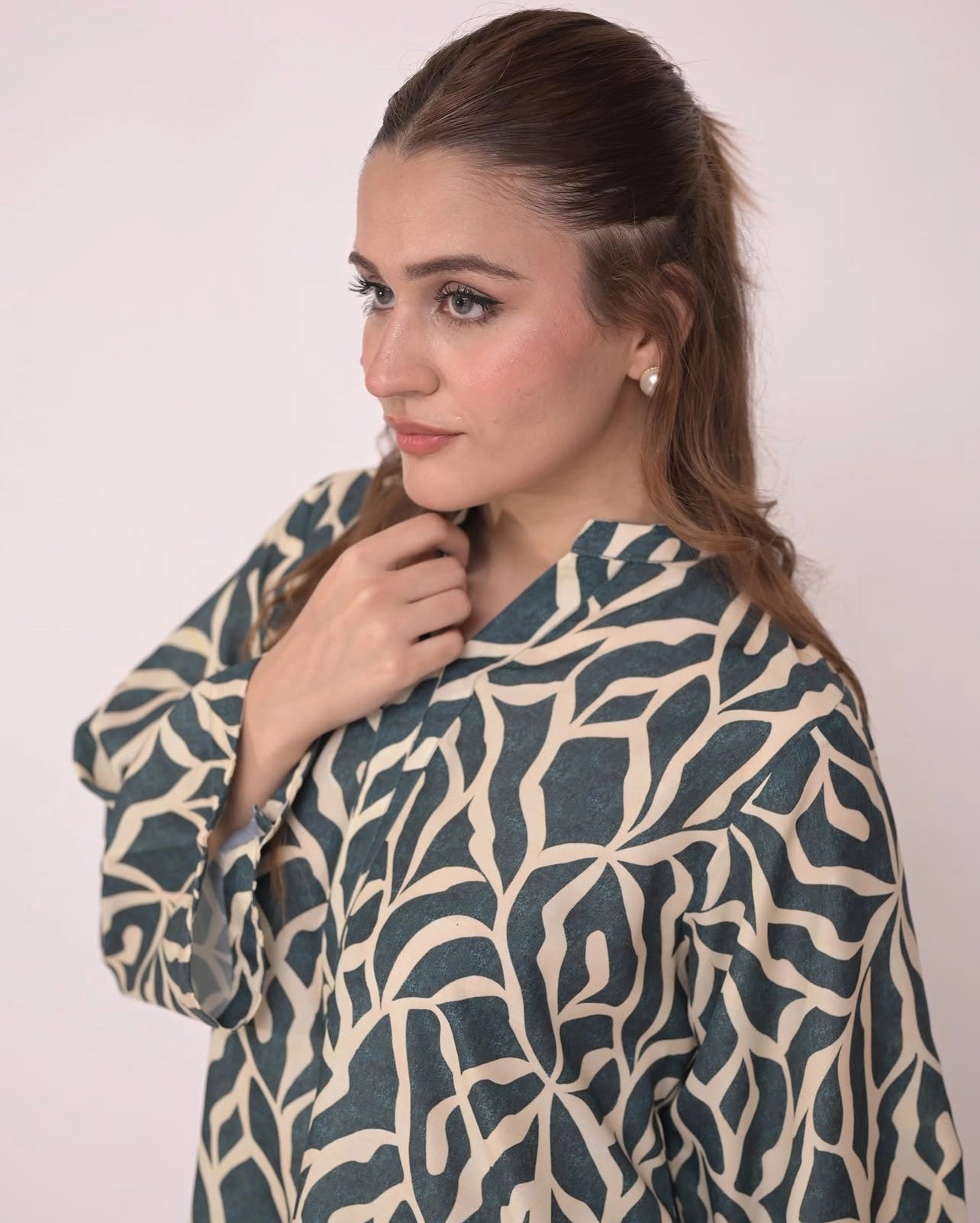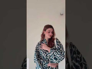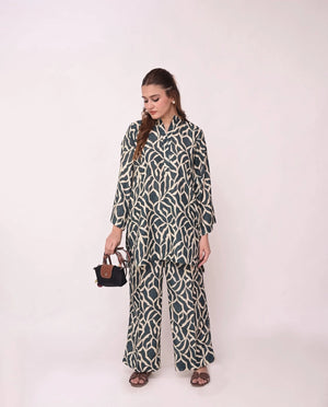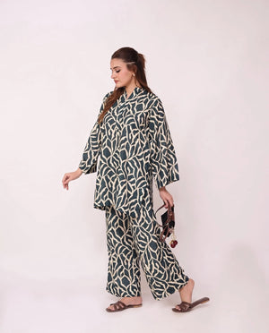 A statement cord set featuring a printed short-length shirt with a sleek collar, paired with matching wide-leg trousers. The bold abstract foliage print adds depth and flair, making it a go-to look for effortless, elevated everyday style.