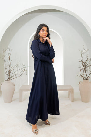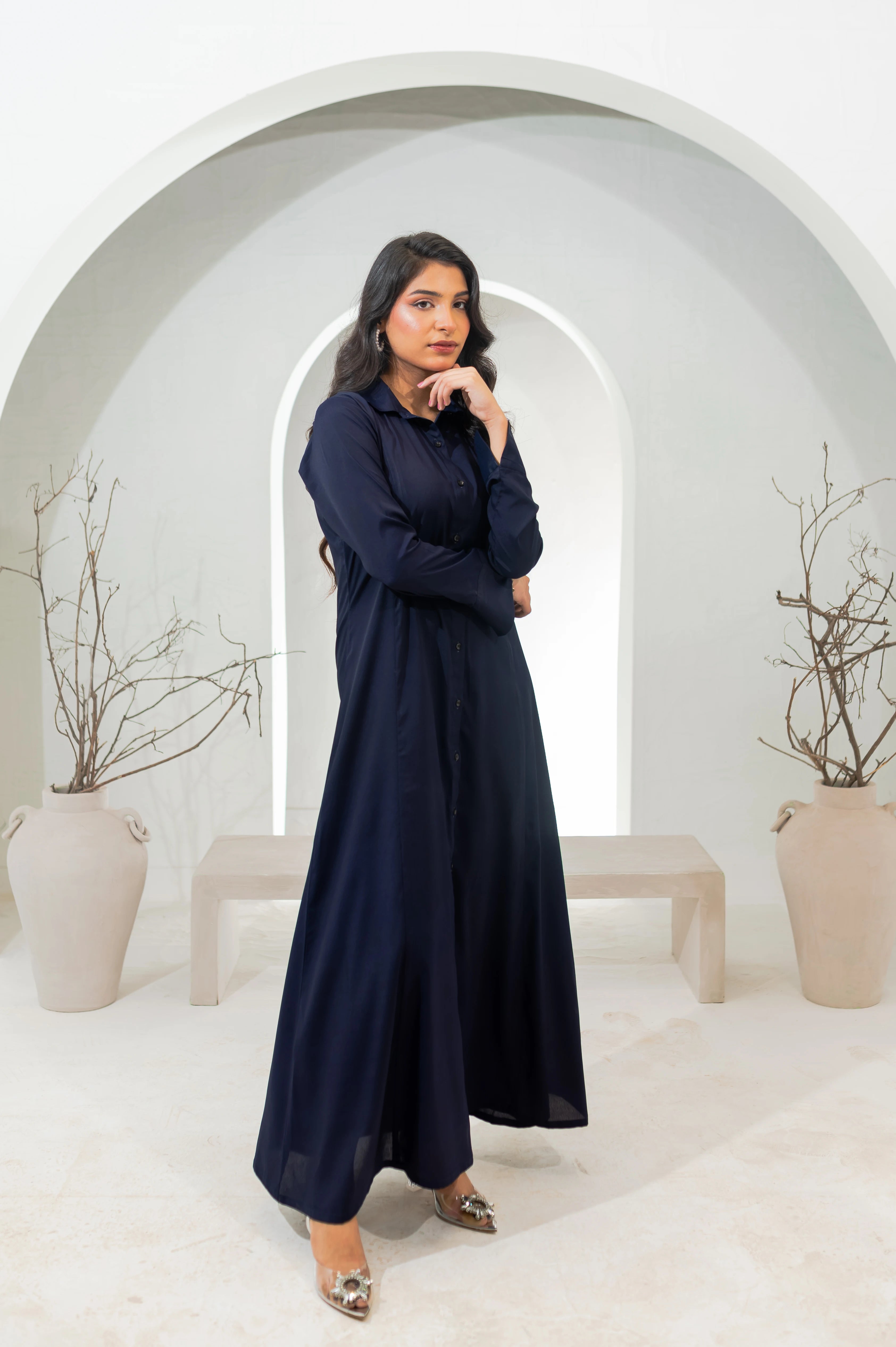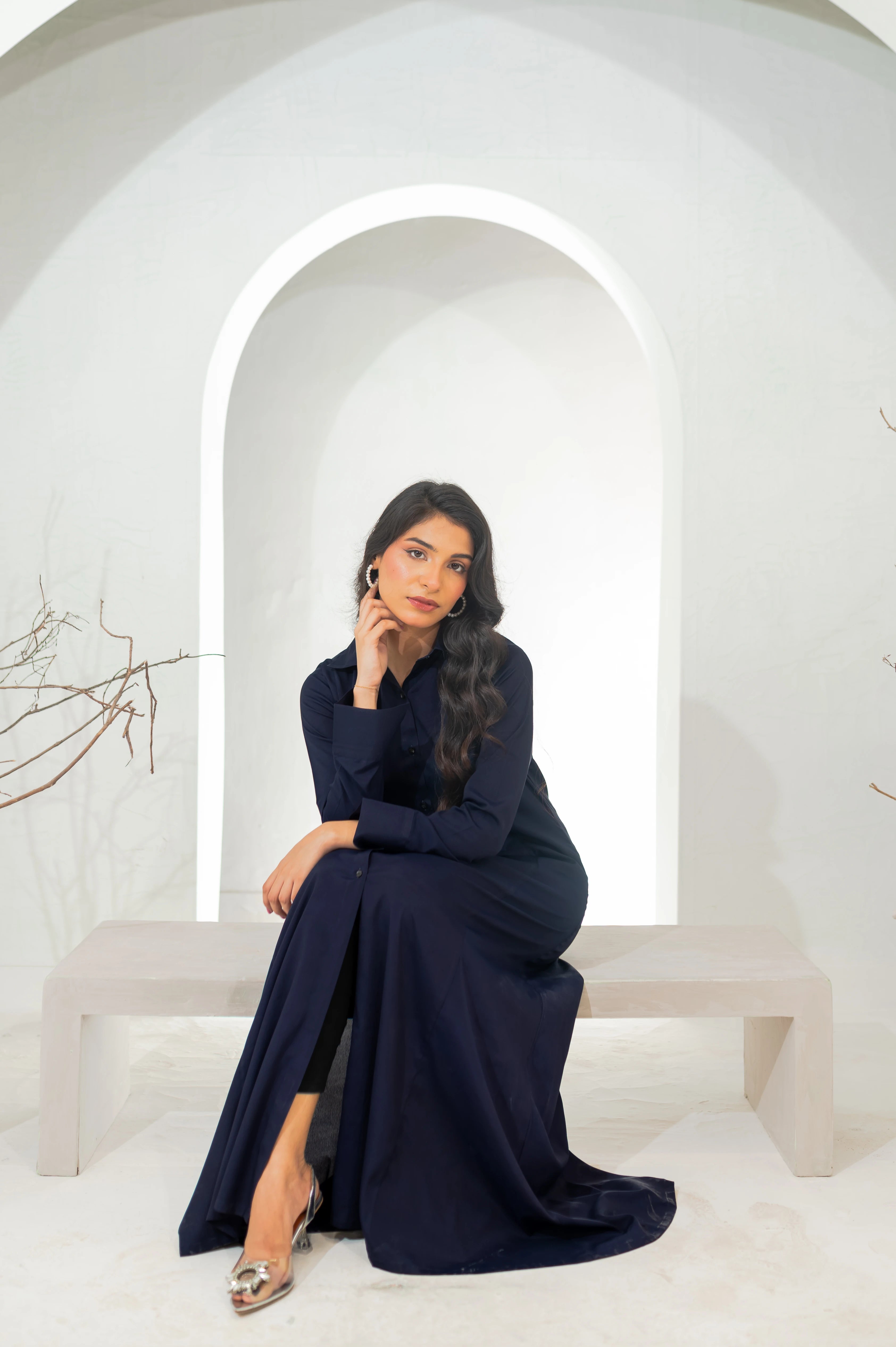 Embrace the epitome of comfort and style with our stunning French Navy Long Dress. Crafted from premium, wrinkle-free crepe fabric. It’s a shirt collar button down long dress with cuffed sleeves. Its flowing, floor-length design makes it perfect for any occasion, from a casual day out to a special evening event. The wrinkle-free fabric ensures you look polished and put-together, without the hassle of ironing.