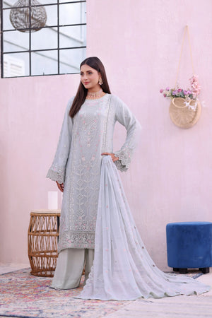 Each 3-piece set includes a ready-to-wear luxury embroidered chiffon shirt, an exquisite embroidered chiffon dupatta, and a dyed viscose trouser tailored for comfort and refinement.