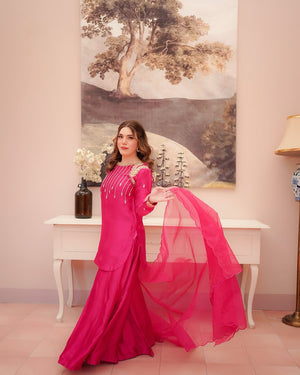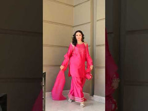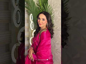 On Eid mornings, the world awakens to vibrant hues, much like Fuchsia Rose. This hot pink outfit combines tissue silk fabrics with hand embroidery and sequin work, complemented by an Organza dupatta. Ideal for those who love bold fashion and want to make a statement during Eid gatherings!