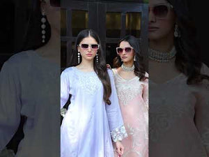 A dreamy fusion of elegance and grace, Fuzzy is a beautifully embroidered Karandi Net ensemble, perfect for summer festivities. The soft pink hue enhances its timeless charm, while the delicate cutwork on the sleeves and daman adds a refined touch. Paired with classic white trousers featuring intricate lace detailing and schiffli embroidery on the shalwar, this two-piece stitched outfit exudes sophistication, making it an ideal choice for elegant gatherings.