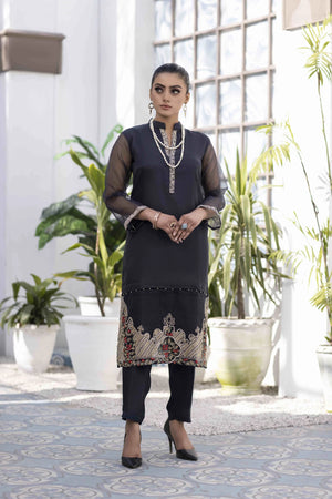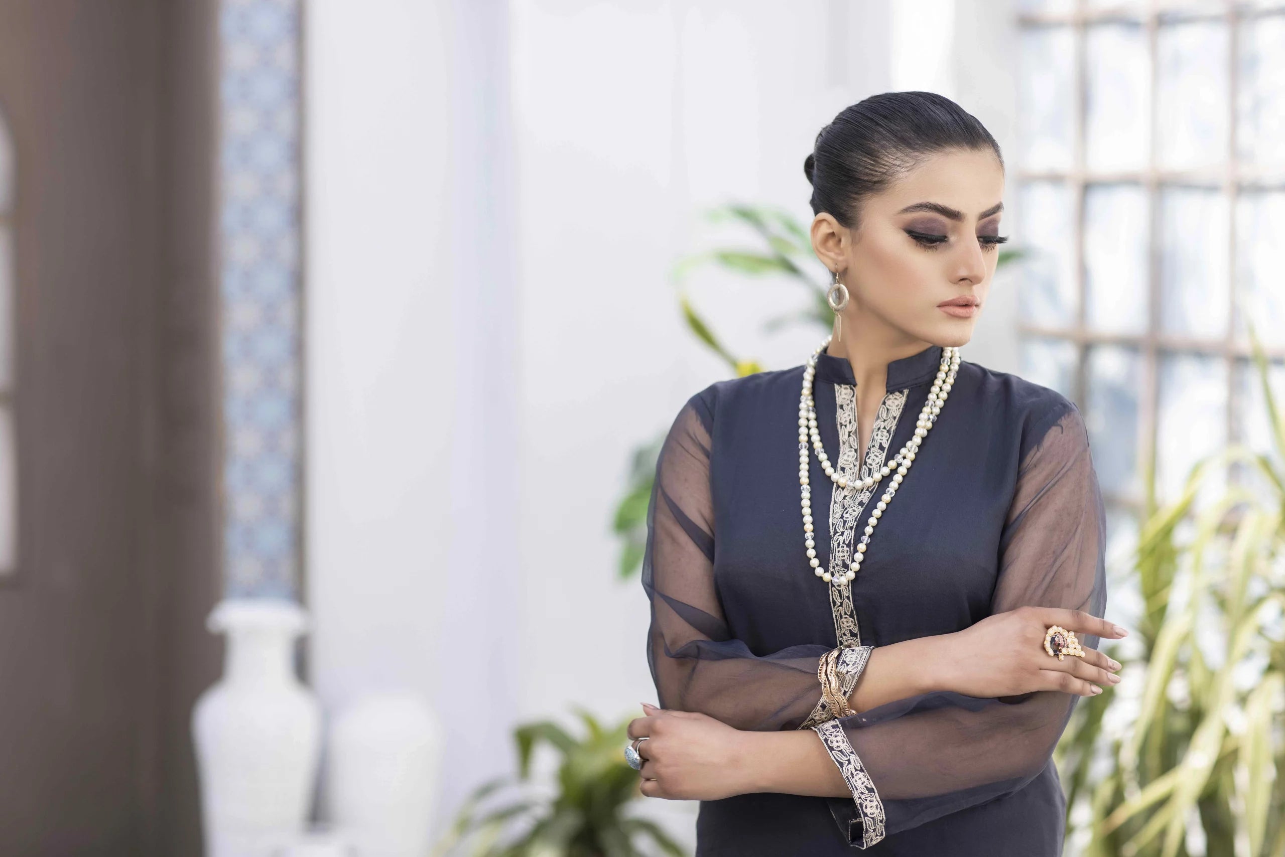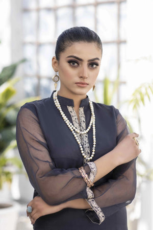 This black dress is a must-have item for this season. The delicate white embroidery covering the daman area and a sleek minimal embroidery line on the neck give an absolutely decent appearance. For evening occasions, this ready-to-wear collection piece is paired with the grip trousers. The organza fabric adds weight to the overall look of this dress.
