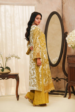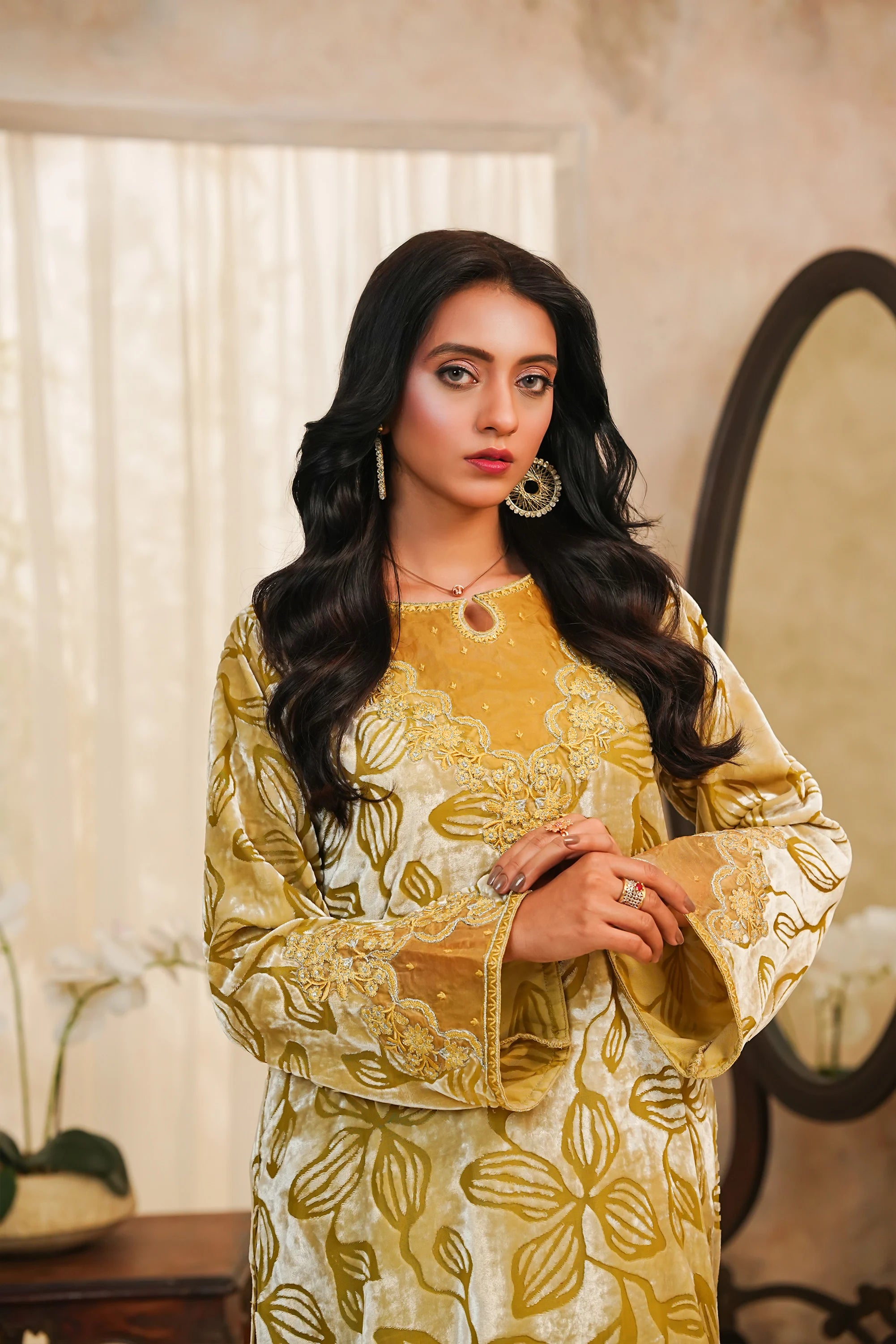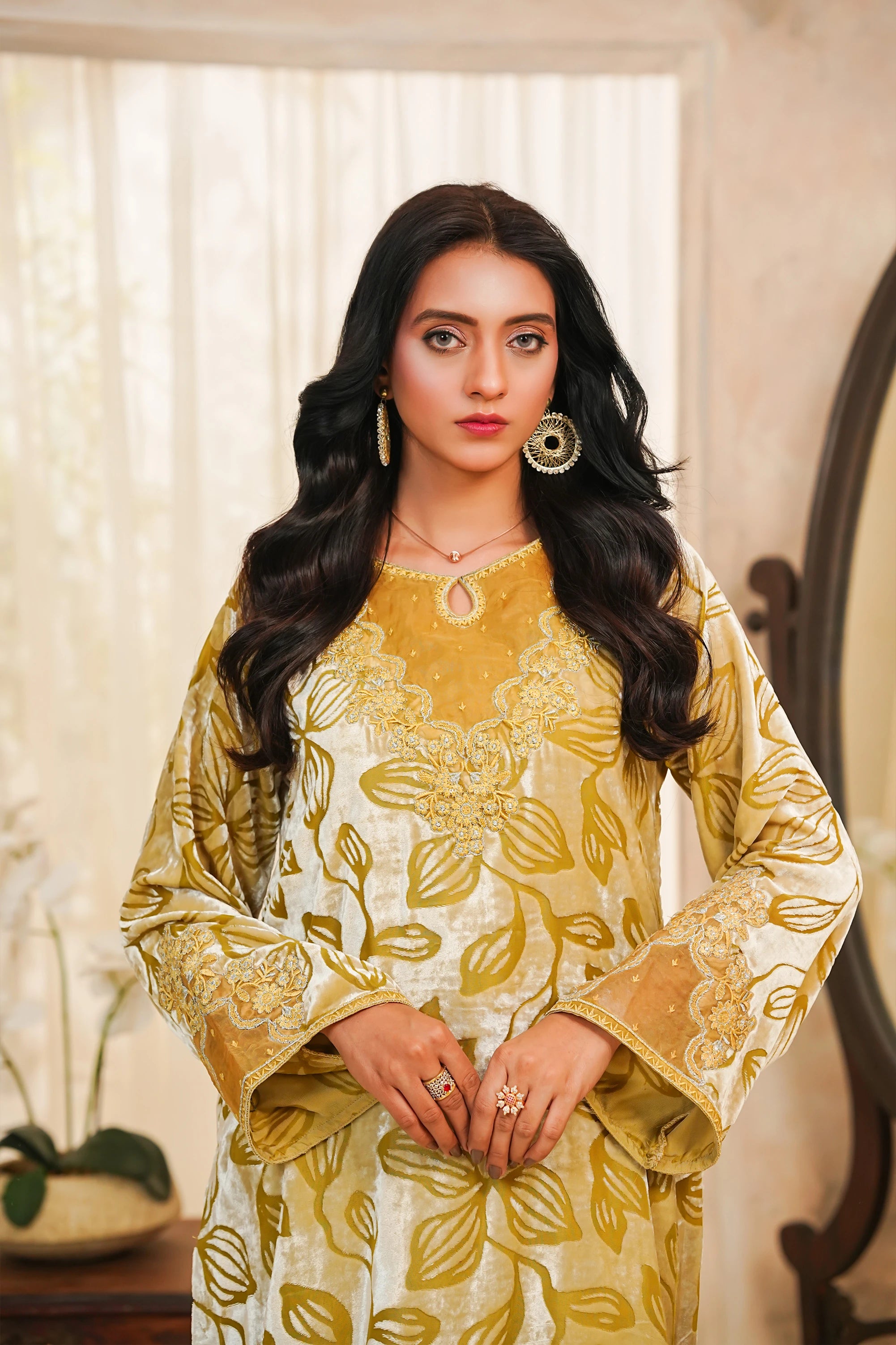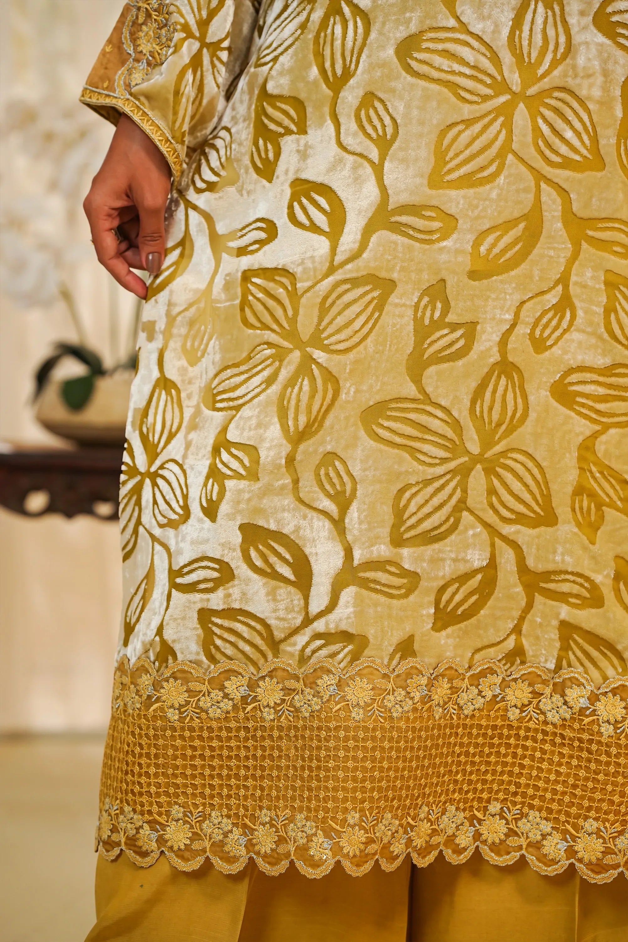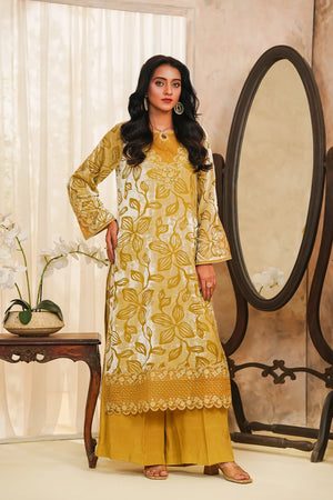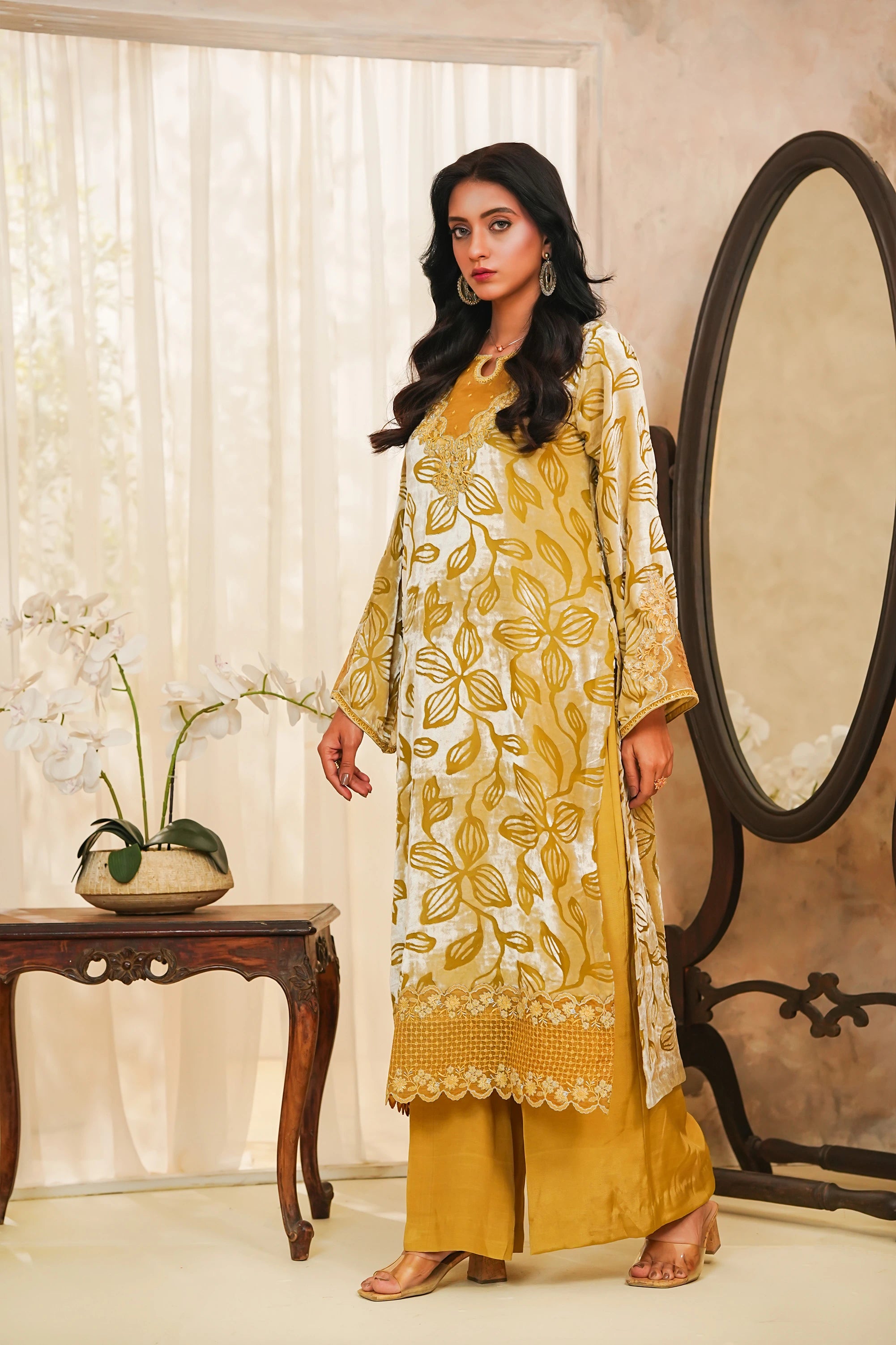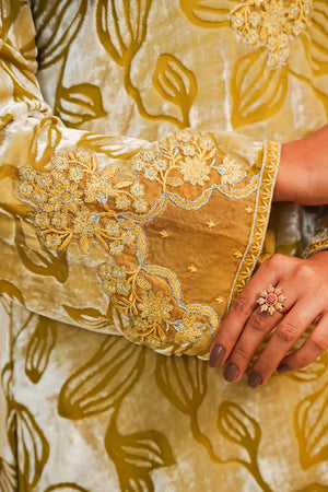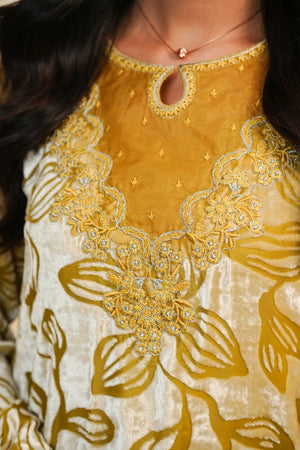 A luxurious and striking two-piece ensemble featuring a rich, straight-cut Velvet shirt in a deep mustard/golden hue. The shirt is opulently adorned with all-over floral patterning, accentuated by fine silver zari and thread embroidery. Sophisticated details include delicate organza patches on the neck, sleeves, and border, and a stylish cut-work daman (hem). The outfit is perfectly balanced with tailored wide-leg trousers crafted from smooth Raw Silk. This piece is designed for ultimate formal flair, making it ideal for festive and winter occasions.✨