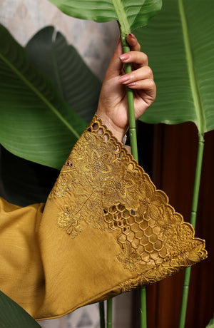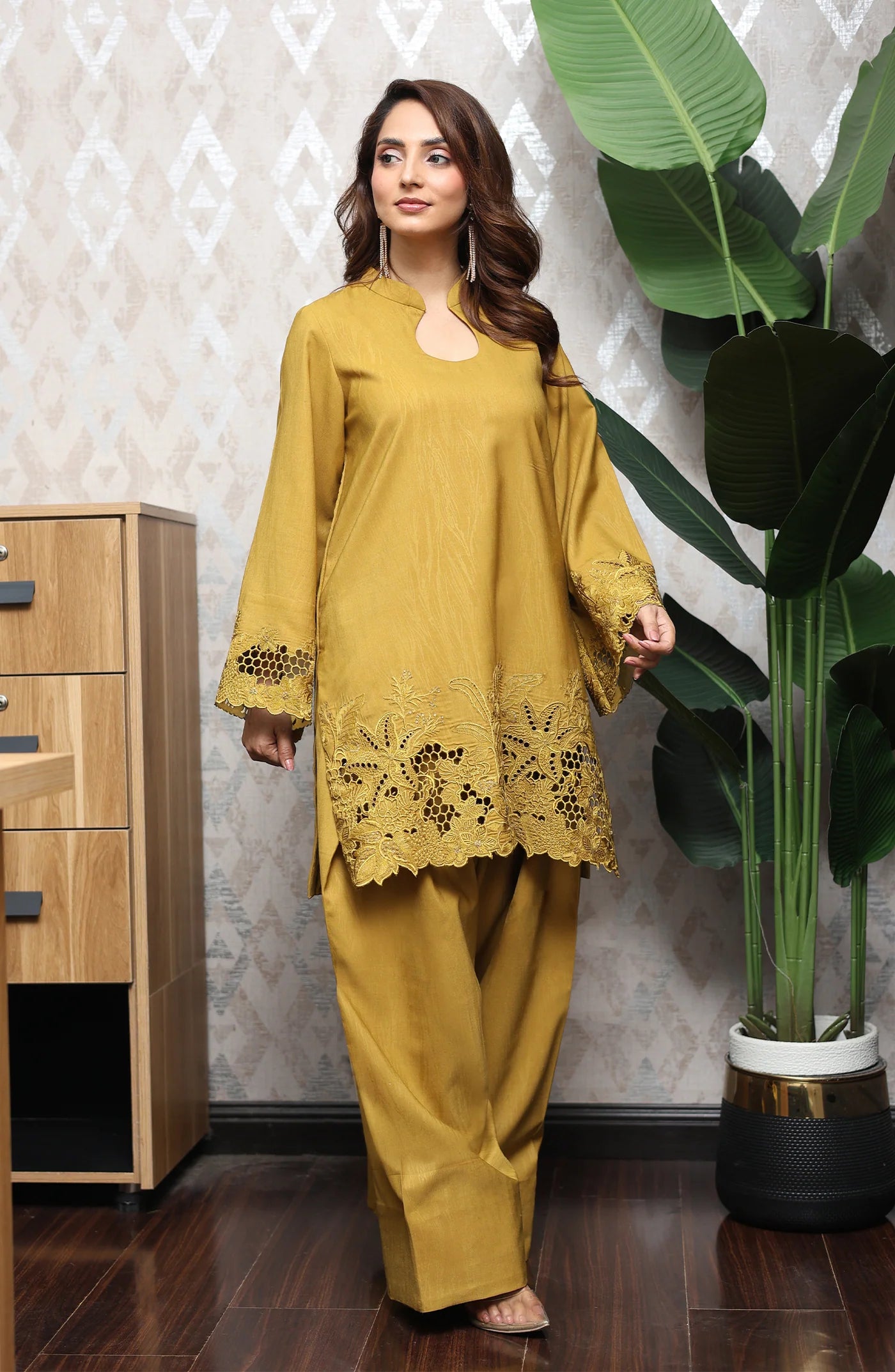 This ensemble features a well-tailored mustard shirt with a beautifully designed neckline, offering a harmonious blend of tradition and modernity. The shirt is adorned with intricate cutout details and bold tropical embroidery along the border, adding a touch of artisanal charm. The flared sleeves mirror the embroidery, enhancing the cohesive design. Complementing the shirt is a stunning traditional farshi shalwar, known for its flowing, floor-length flare that exudes regal elegance. Crafted from high-quality fabric, this co-ord set ensures comfort and durability, making it suitable for various occasions.