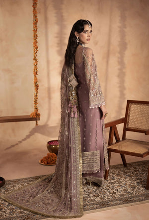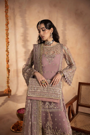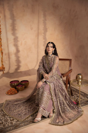An elegant tea pink ensemble featuring a long net kurta, intricately embroidered and hand embellished. Paired with matching trousers and a dupatta, this outfit exudes sophistication and opulence.