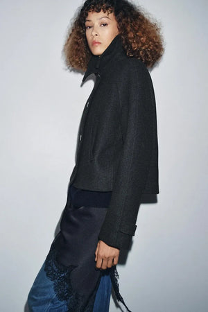 Elevate your winter wardrobe with the Graphite coat. Crafted from luxurious premium wool, this structured jacket offers a sleek, modern look in a sophisticated charcoal hue. It features a sharp, high collar and large, contrasting buttons, creating a contemporary, short silhouette that is perfect for smart layering and essential warmth. 🖤