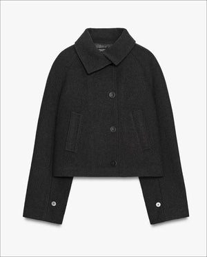 Elevate your winter wardrobe with the Graphite jacket. Crafted from luxurious premium wool, this structured jacket offers a sleek, modern look in a sophisticated charcoal hue. It features a sharp, high collar and large, contrasting buttons, creating a contemporary, short silhouette that is perfect for smart layering and essential warmth. π€