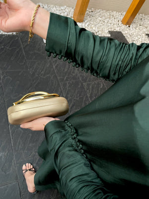 A refined 2-piece solid outfit in a rich green slate shade, crafted on premium tussel silk. Featuring fitted buttoned sleeves for a tailored look, this ensemble strikes the perfect balance between classic charm and modern elegance.