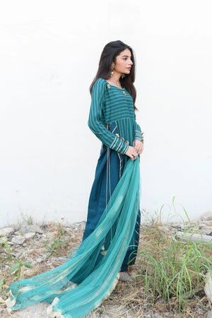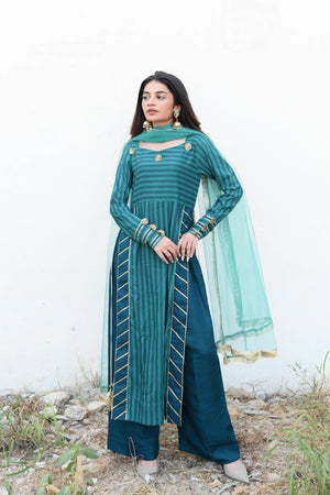 This beautiful set combines a polycambric shirt with intricate gota lace detailing along the sides and a stunning gota flower embellishment on the neckline. The dori at the side chak adds a touch of traditional charm. Paired with a sleek raw silk bottom and a delicate net dupatta with elegant lace along all edges.