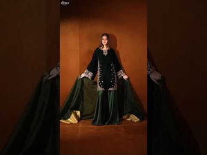 Elevate your festive and wedding wardrobe with this stunning velvet dress design for wedding, crafted in rich green and black velvet and beautifully embroidered for a premium formal look. This stitched 3PC set brings together elegance, comfort, and timeless Pakistani fashion.