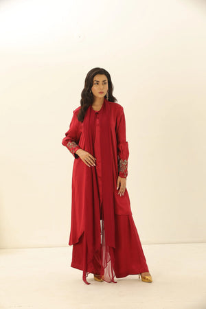 This stunning red silk and chiffon two-piece ensemble features exquisite cuff embroidery adorned with delicate pearls and zari sittara, adding a touch of opulence to the design. The front open cut of the shirt showcases a stylish draped design line, creating a graceful and modern silhouette. Paired with matching trousers, this outfit is perfect for making a statement at any special occasion