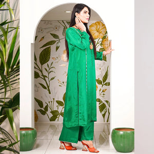 Drape yourself in sophistication with Gul-e-Rana, a stunning green Russian silk ensemble adorned with champagne & multi-stone embroidery on the shirt and trouser. Paired with a digitally printed multi-color silk dupatta, featuring mirror and stone detailing with golden kinara lace—this ready-to-wear 3-piece is the perfect festive look for Eid or any special occasion.