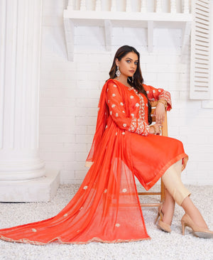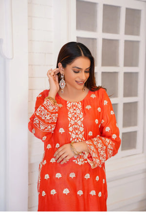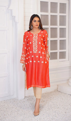 This coral shirt is the perfect pick for the season. Contrasted with beige embroidery of floral motifs that stand out elegantly. Pair it with beige trousers and a coral dupatta to complete the look.
