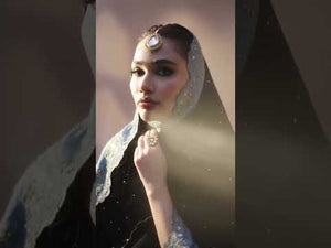 This captivating dress in black and grey-blue is a stunning fusion of elegance and drama. Crafted with rich fabrics, the outfit features intricate embellishments that shimmer subtly across the bodice and sleeves, adding depth and sophistication. The black base is beautifully contrasted by soft grey-blue accents, creating a modern, refined palette.
