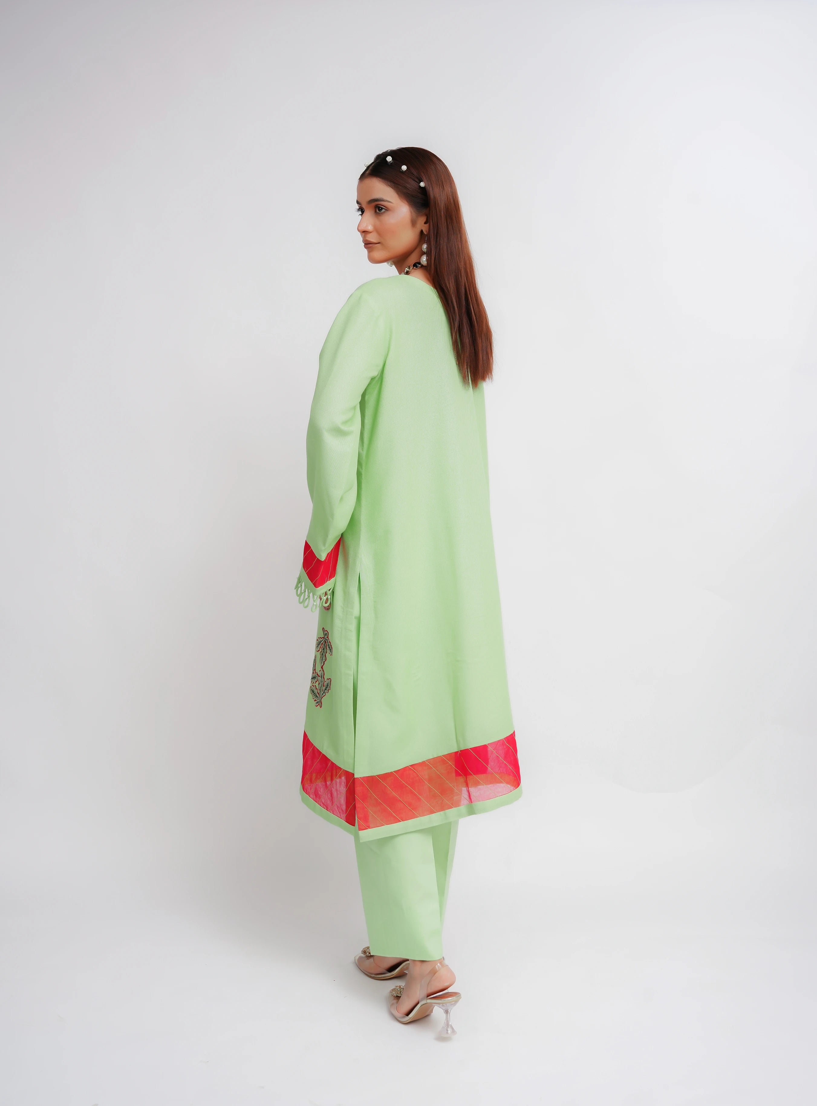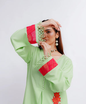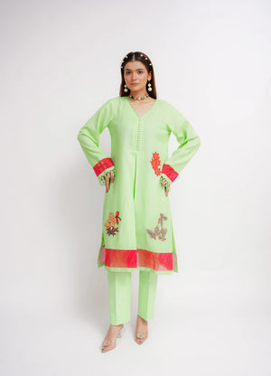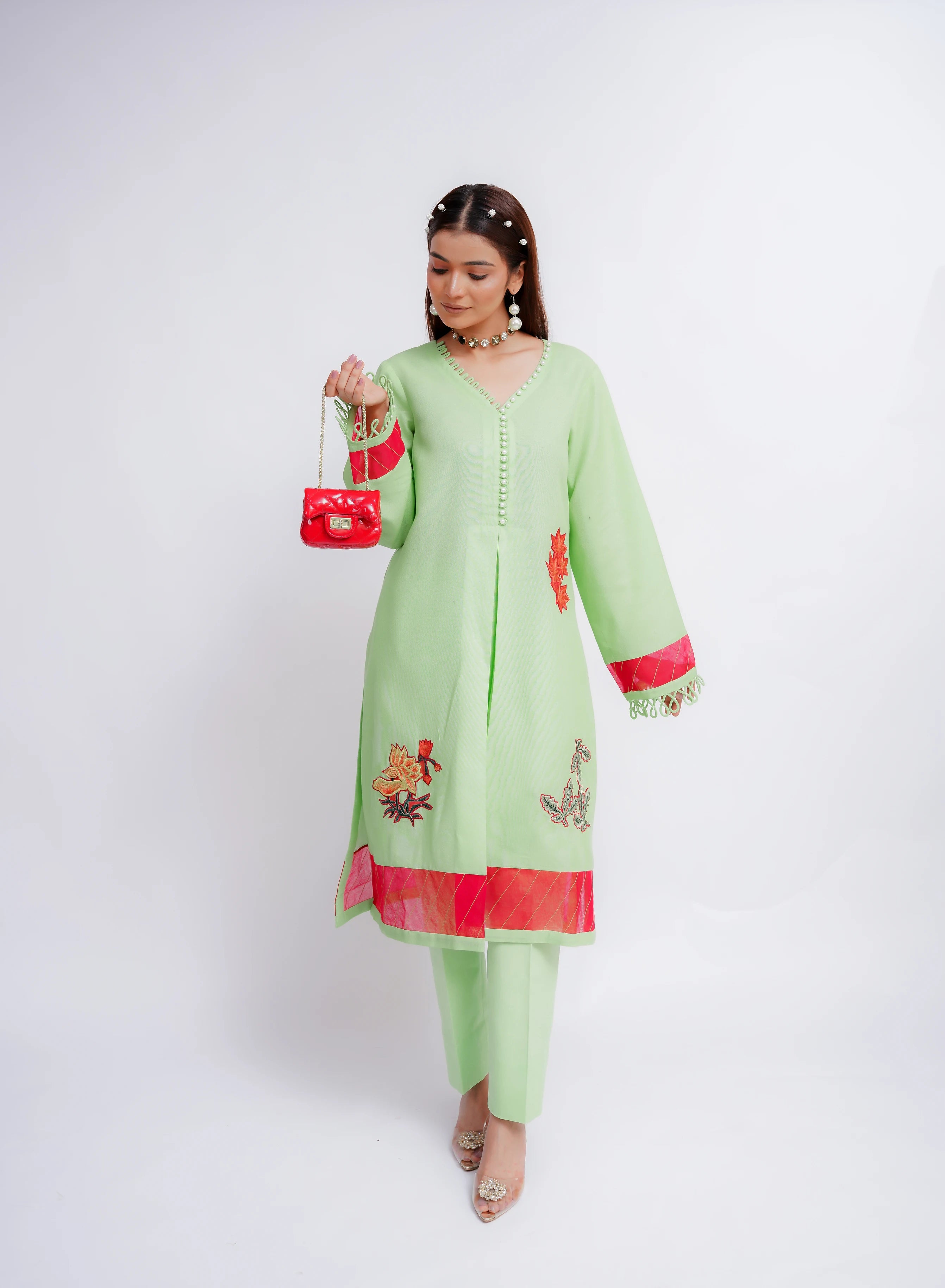 Additional Description: Bring freshness to your wardrobe with this apple green embroidered 2-piece basic set. Crafted from breathable, lightweight fabric, this set offers a perfect blend of simplicity and style. The long, straight-cut tunic is enhanced with fine embroidery along with pearls on the neckline, adding a subtle yet eye-catching detail. Paired with matching straight trousers, the set creates a cohesive, modest silhouette that’s perfect for everyday wear or casual gatherings.