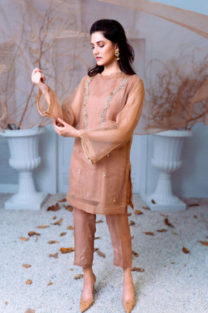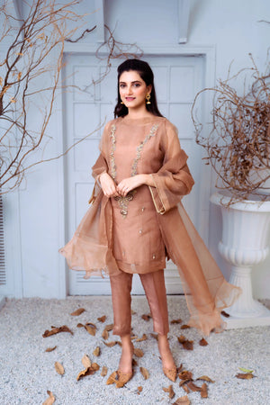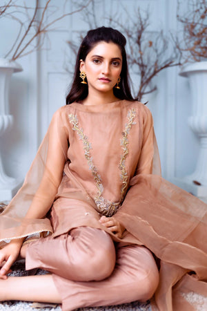The perfectly structured tessellations in a honeycomb unwinds the beauty in harmony and peace. For giving a subtle message of staying peaceful and concluding conflicts, this dress is a masterpiece. Brownish-cinnamon base is carefully utilised with our signature embroidery. You can see a glimpse of elegance and brilliance and that is the driving force which holds it all together – salvages it from the chaos.