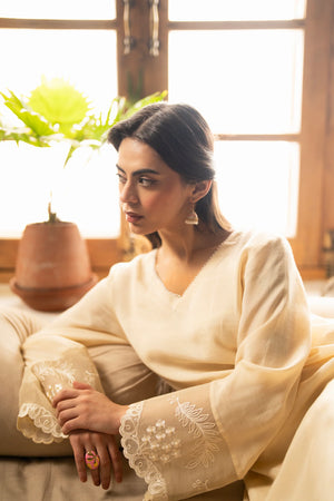 Turn heads with this ivory raw silk ensemble, crafted for the modern yet tradition-loving woman. The shalwar sleeves feature intricate embroidery, soft-hued pearls, and delicate adda work, creating a luxurious, fashion-forward finishPaired with an optional chiffon dupatta, this outfit blends classic elegance with contemporary styling—perfect for festive brunches, family gatherings, or casual ethnic chic looks. The soft, flowing silhouette ensures comfort while making a subtle statement of sophistication.